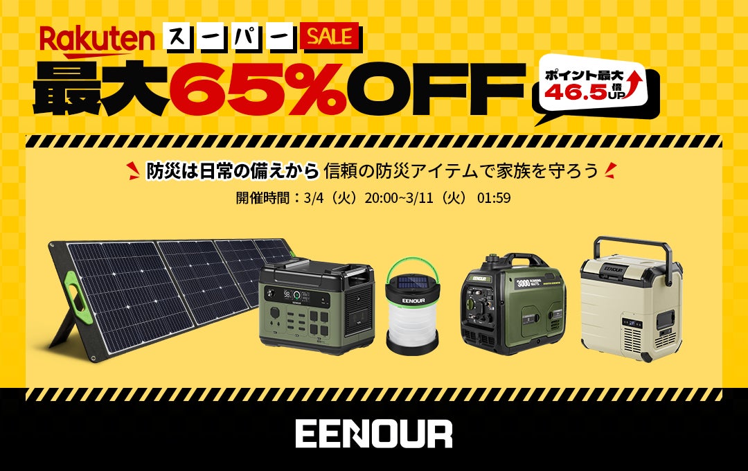 アウトドアおよび防災関連の製品を提供する人気ブランドEENOUR(イーノウ)は、楽天市場店と公式楽天市場店において、「楽天スーパーSALE」を3月4日(火)~3月11日(火)まで実施いたします。