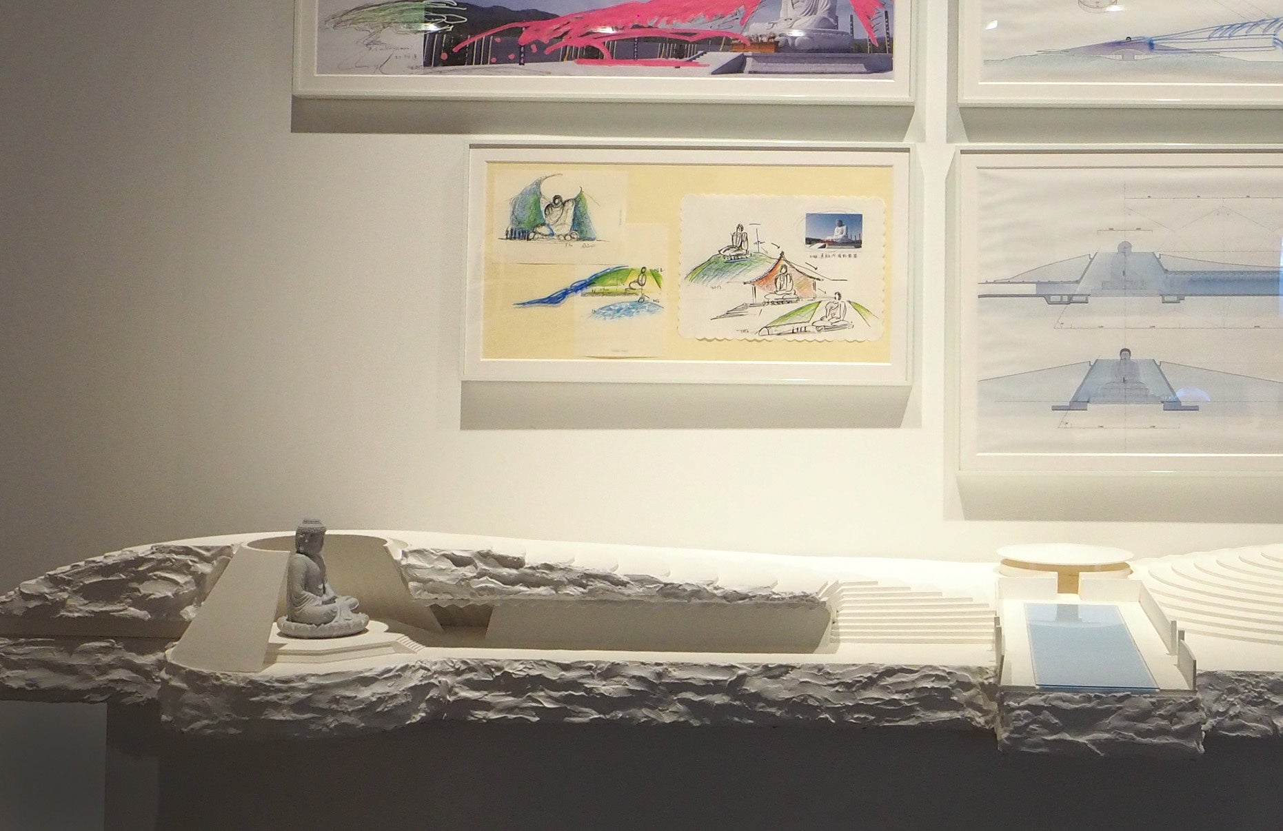 約1,400㎡の地下空間には、約60件もの建築プロジェクトや、230点余りのスケッチ・ドローイング・模型などが並び、今なお「青春」を生きる稀代の建築家の熱量を体感することができます。会場は大きく分けて「挑戦の軌跡」と「安藤忠雄の現在」の2つで構成されており、「挑戦の軌跡」エリアは、1969年から半世紀に及ぶ安藤氏のキャリアを一望にするものです。