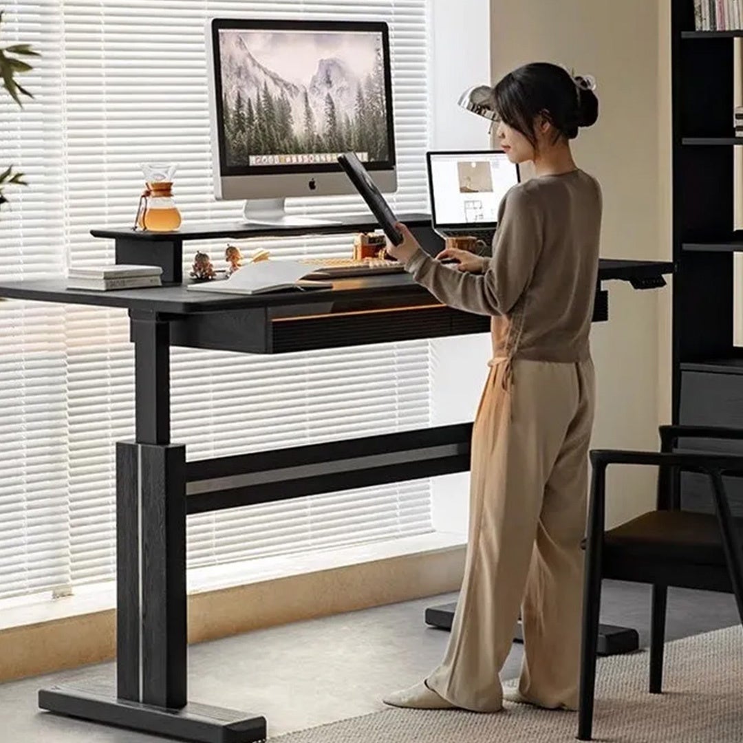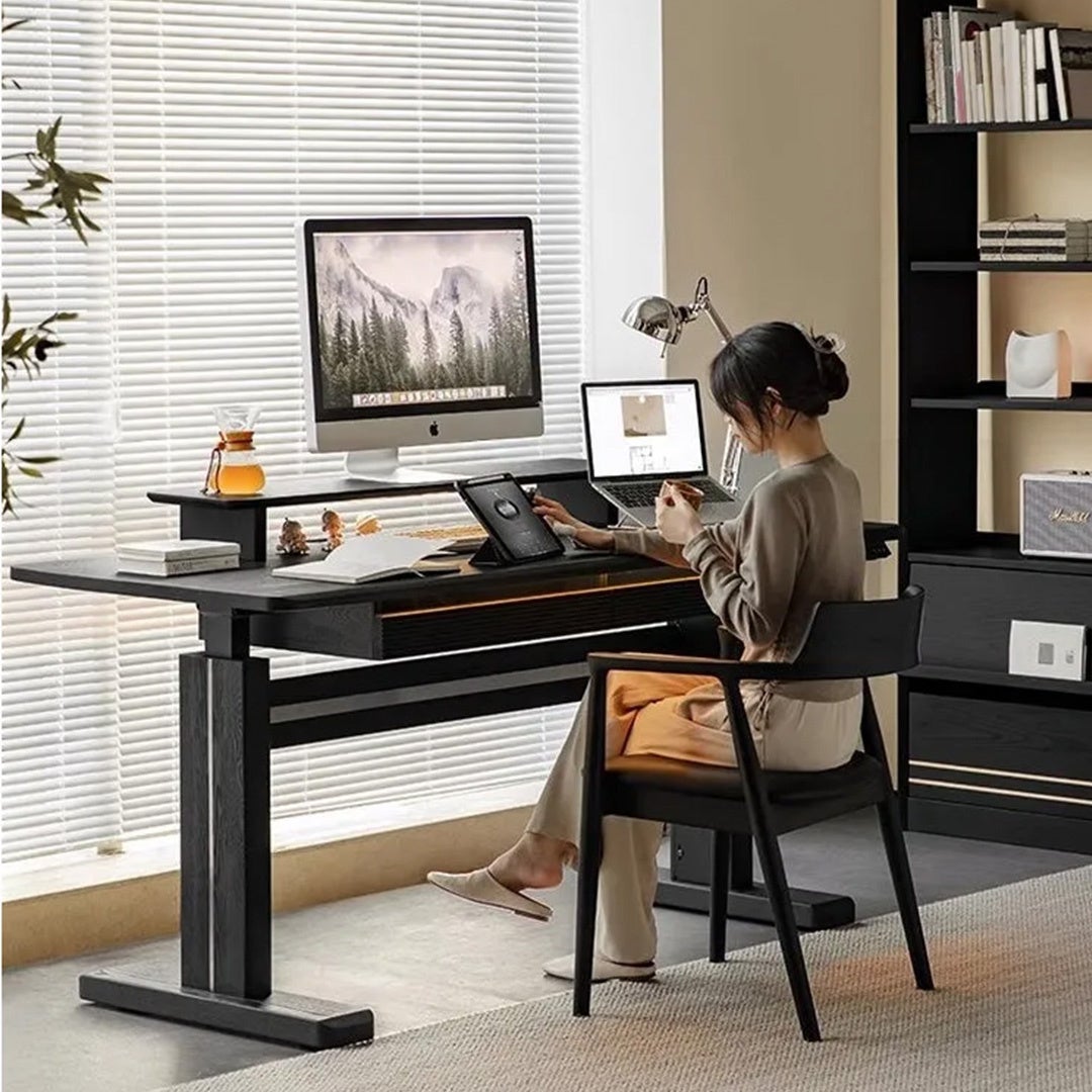 漆黒の洗練されたデザインが特徴的な電動昇降デスク。耐久性に優れたホワイトアッシュ材が、上質な空間を演出します。静かでスムーズな昇降機能により、無段階調整で自分の身長にぴったり合わせられ、立っても座っても快適に作業できます。