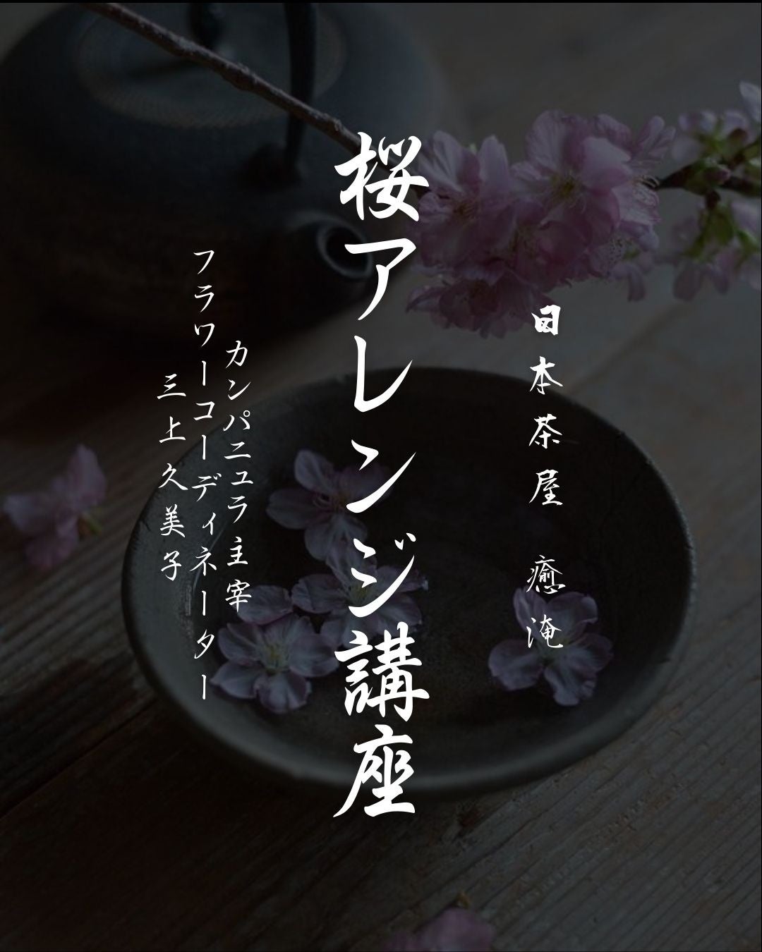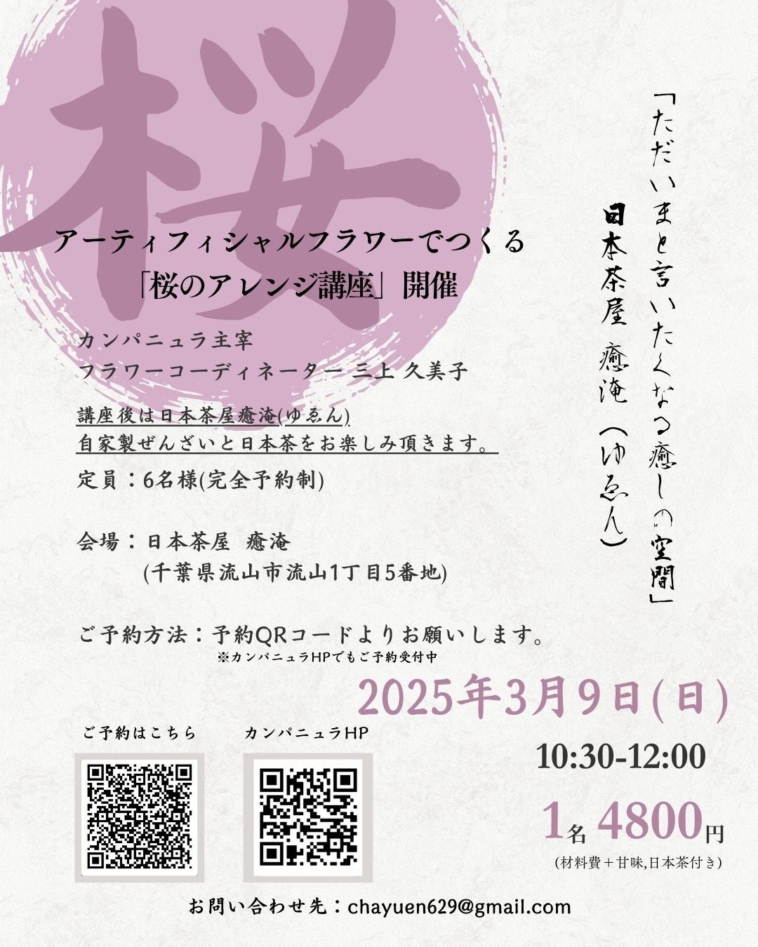 カンパニュラ主宰フラワーコーディネーター三上 久美子による「アーティフィシャルフラワーでつくる春限定 桜アレンジ講座」(主催:株式会社流山ツーリズムデザイン)は、2025年3月9日(日)に日本茶屋 癒淹(にほんちゃや ゆゑん)で開催します。