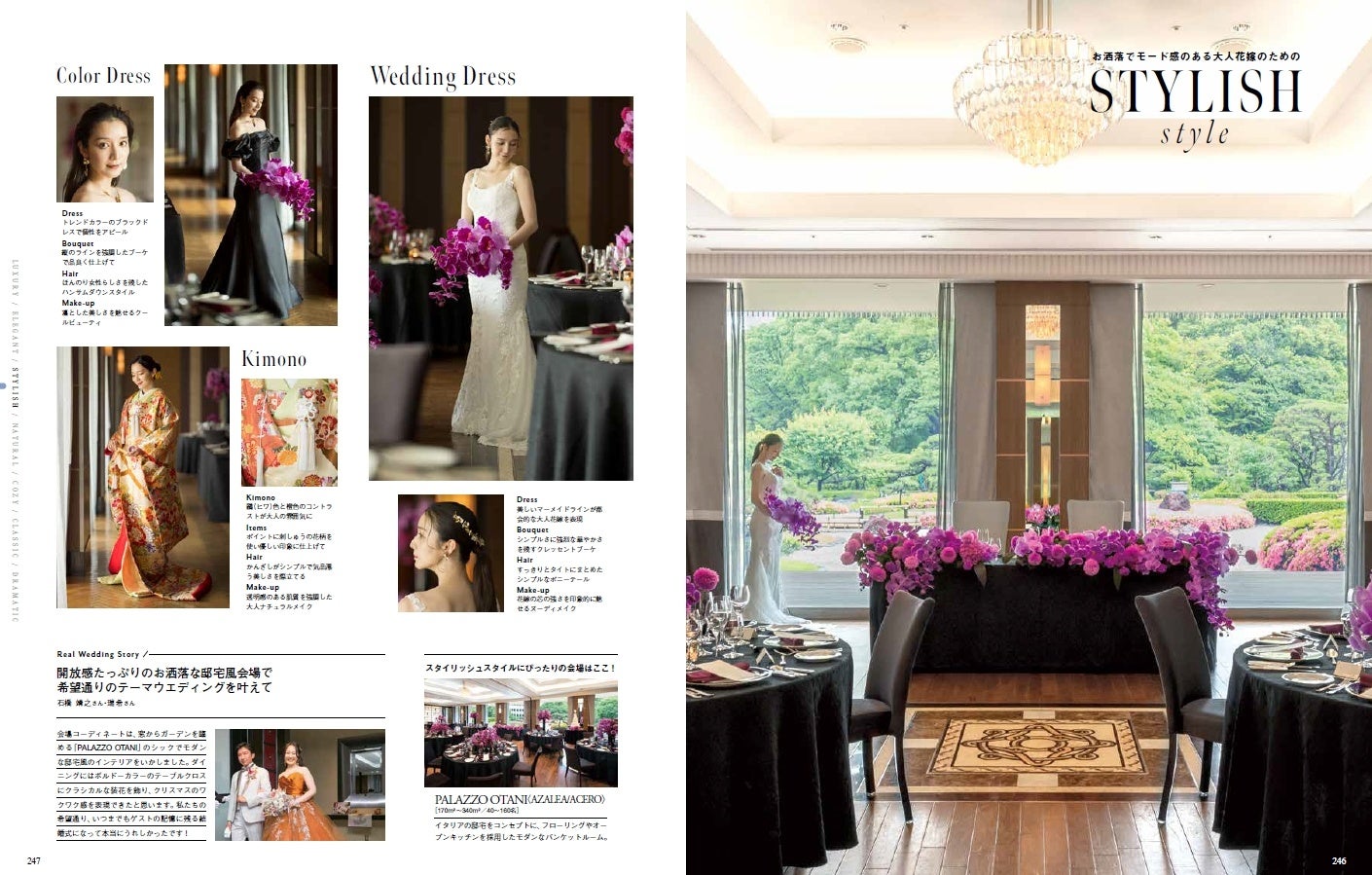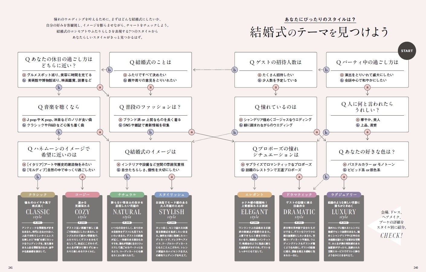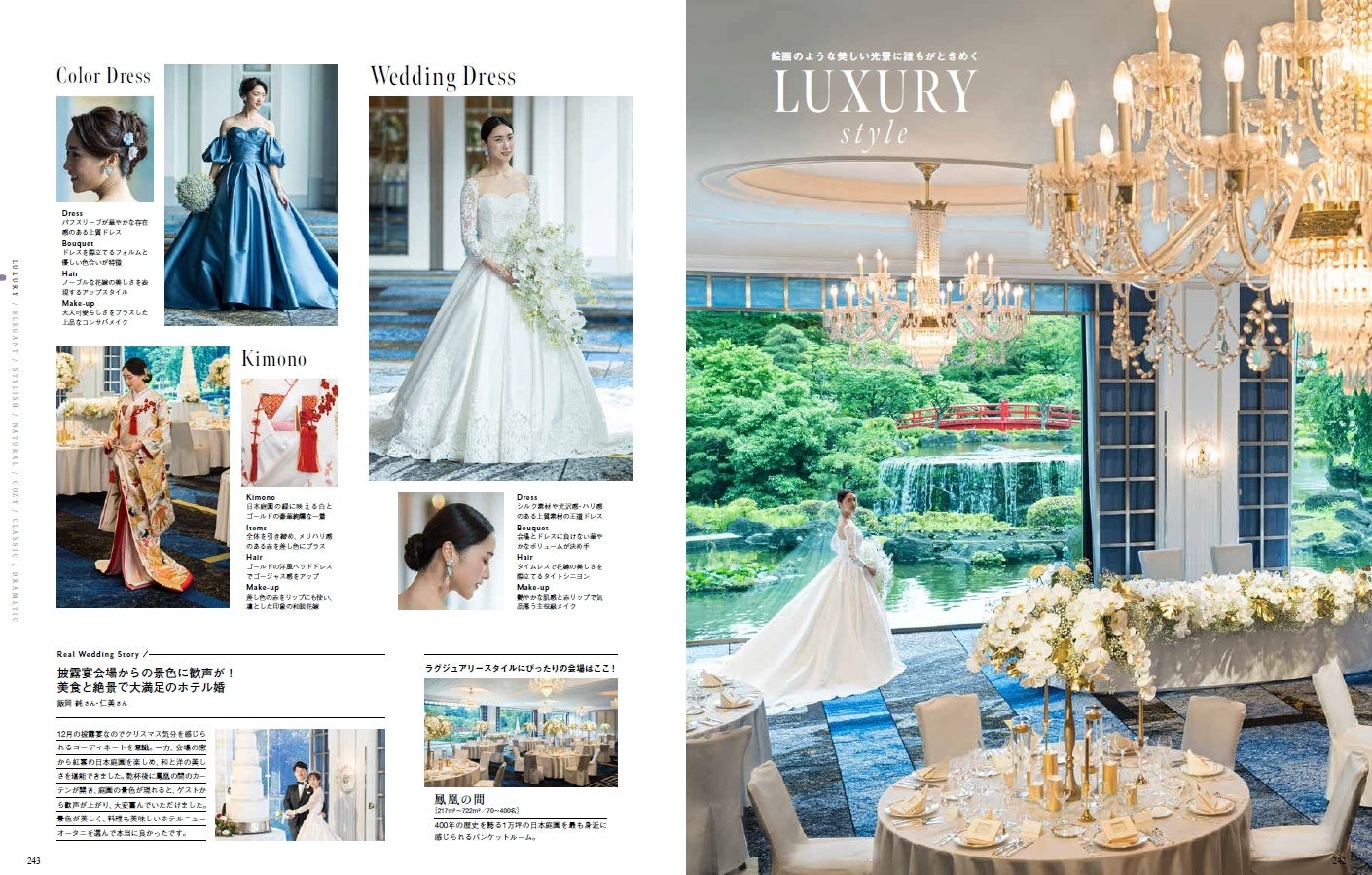 本誌が注目したのは、リアル花嫁たちが希望するウエディングのスタイルと、そのスタイルを叶えられる会場・装花・ドレスなどによるトータルコーディネート。これから結婚準備をはじめる花嫁でも、ぴったりのスタイルが簡単に見つけられるチャートと、結婚式のテーマやコンセプトから導き出された人気が高いスタイルを、「LUXURY」「ELEGANT」「STYLISH」「NATURAL」「COZY」「CLASSIC」「DRAMATIC」の7つにカテゴライズ。魅力的なトータルコーディネートの一部を紹介いたします。