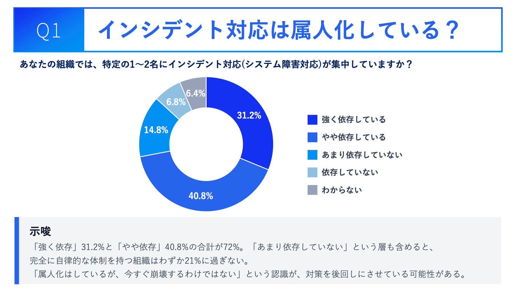 「インシデント対応が特定の1〜2名に集中・依存していると感じますか?」という問いに対し、72.0%が「依存している」と回答しました(「強く依存している」31.2%、「やや依存している」40.8%)。