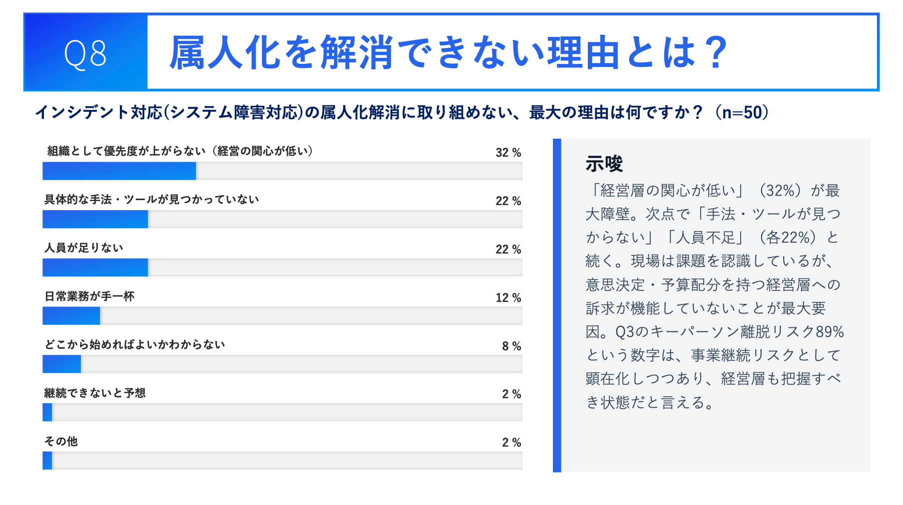 属人化解消にまだ取り組めていない組織(n=50)の最大の理由は「組織として優先度が上がらない(上司・経営の関心が低い)(32%)」でした。