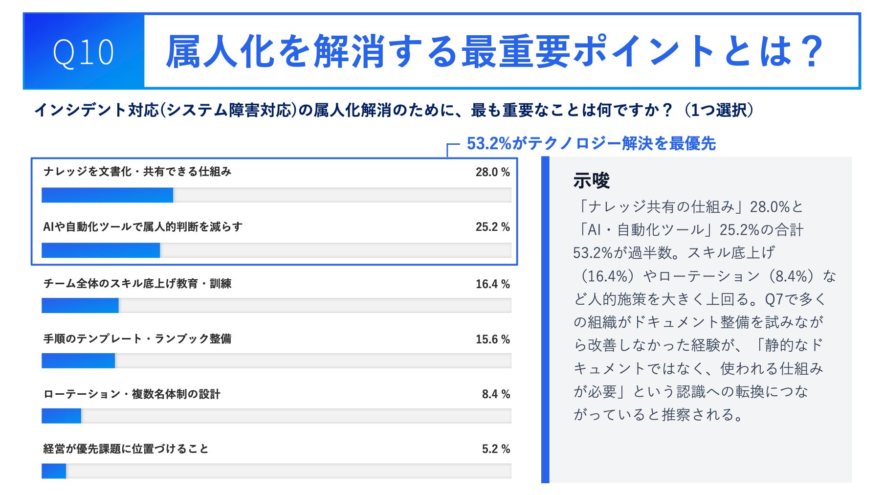 属人化解消のために最も重要なこととして、「インシデント対応ナレッジを文書化・共有できる仕組みを作ること(28.0%)」と「AIや自動化ツールを活用して属人的な判断を減らすこと(25.2%)」が過半数を占めました。