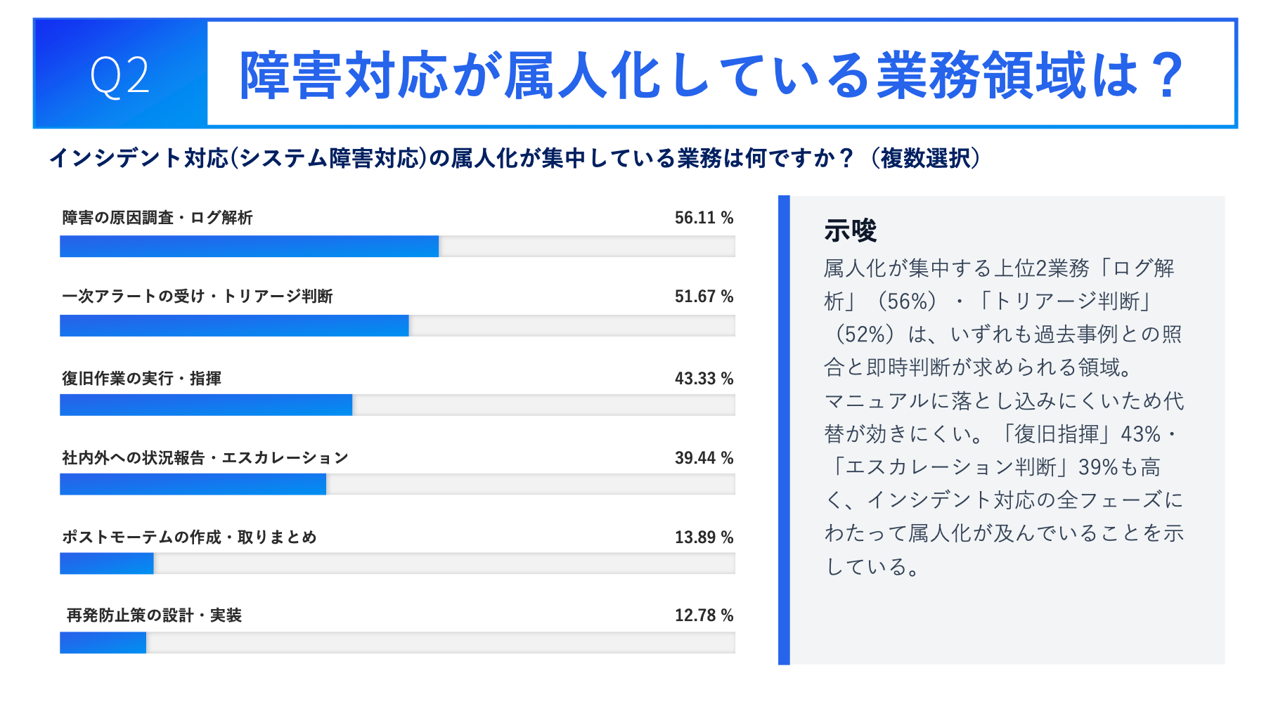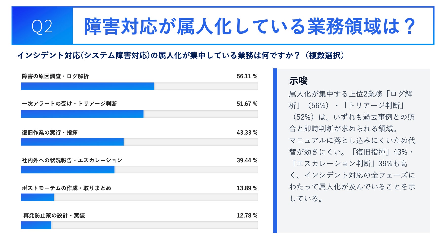 2. 属人化が最も深刻な業務は「ログ解析」56.1%と「トリアージ判断」51.7%