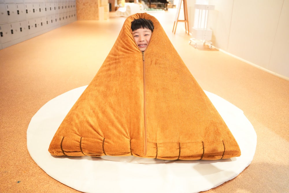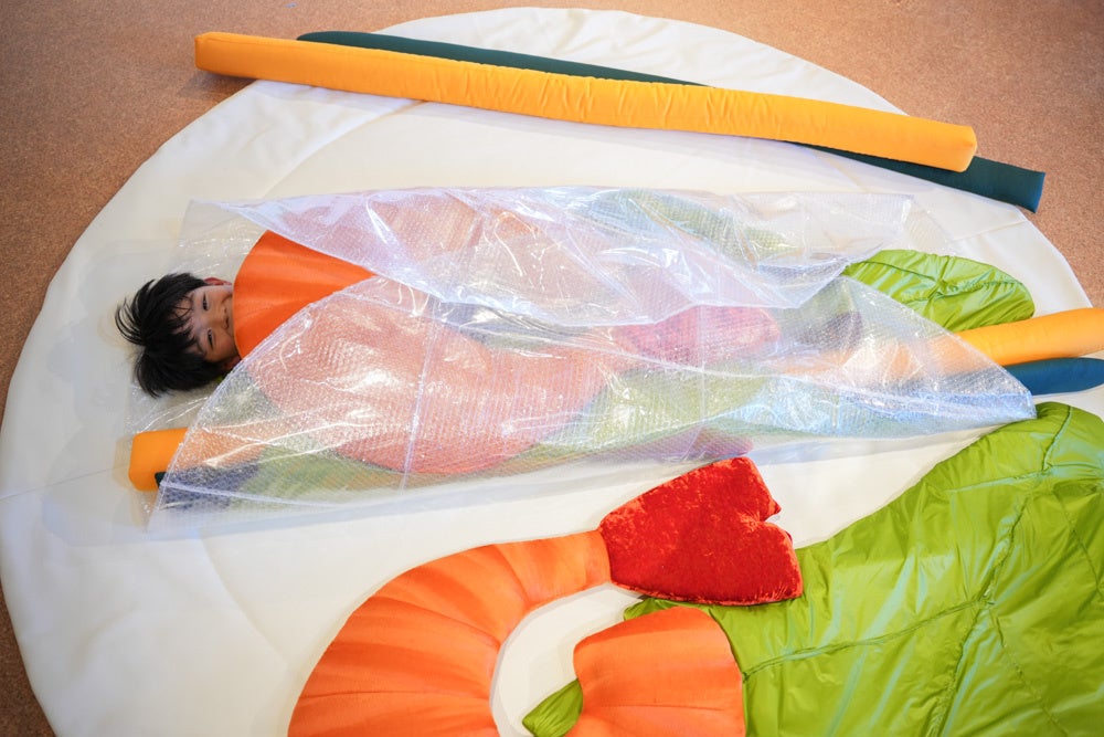 南アジアのサモサ、ベトナムの生春巻き、中国のマントウ、3つのアジア料理から「包む」をキーワードに「自分が具になる」あそびを制作しました。自分が生地に包まれて料理自体になったり、具材を積み上げて遊んだり、料理を通してアジアに触れることができます。料理の豆知識が載っているイラスト付きハンドブックがもらえますので、展覧会とあわせて楽しく学べます。