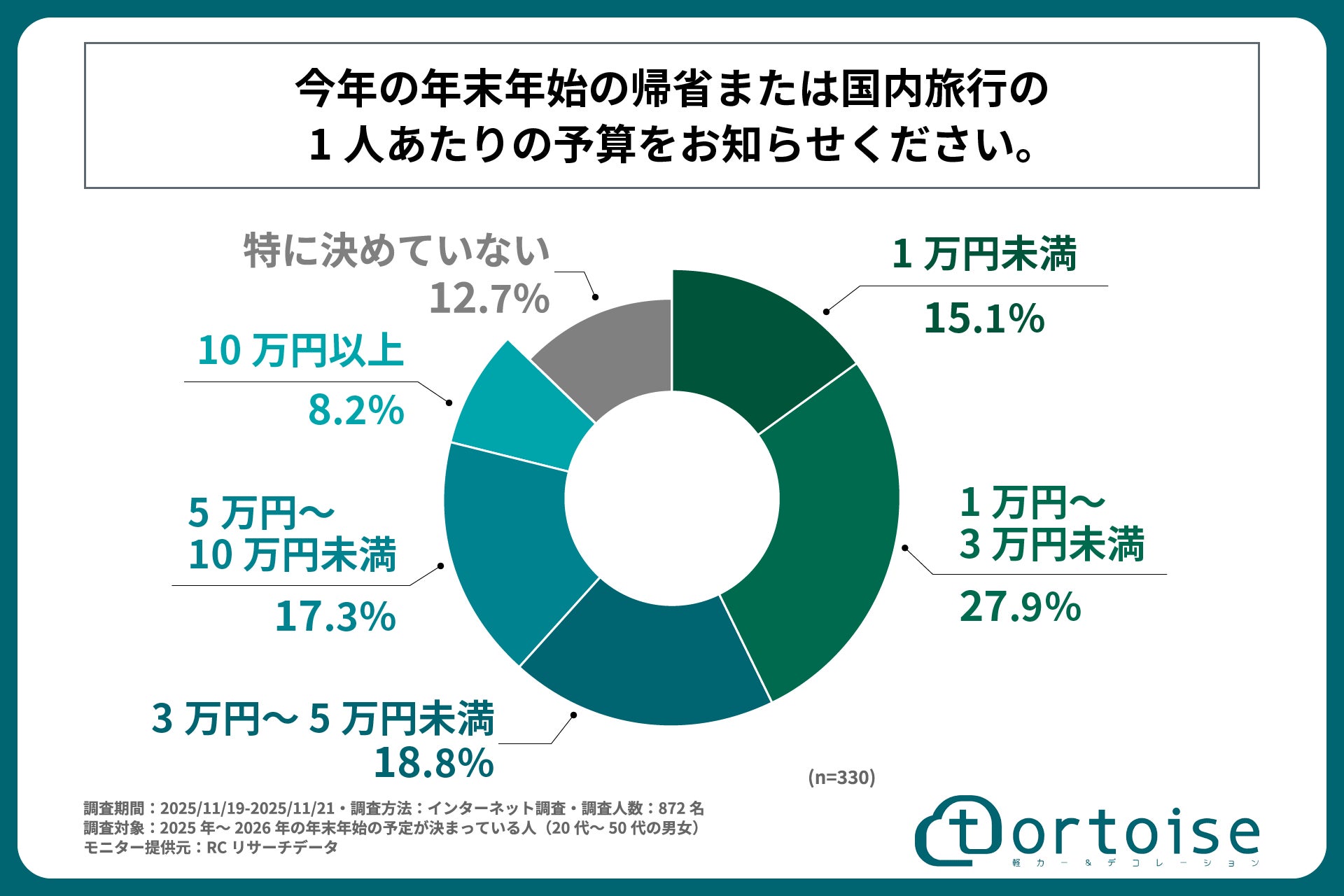 続いて、2025年~2026年の年末年始の予定を帰省または国内旅行と回答した人を対象に「今年の年末年始の帰省または国内旅行の1人あたりの予算」を尋ねる設問への回答では、1位が「1万円~3万円未満」で27.9%、2位が「3万円~5万円未満」で18.8%、3位が「5万円~10万円未満」で17.3%という結果になりました。この結果から、2025年~2026年の年末年始の帰省または国内旅行の1人あたりの予算は「1万円~3万円未満」で考えている人が最も多いことが判明しました。