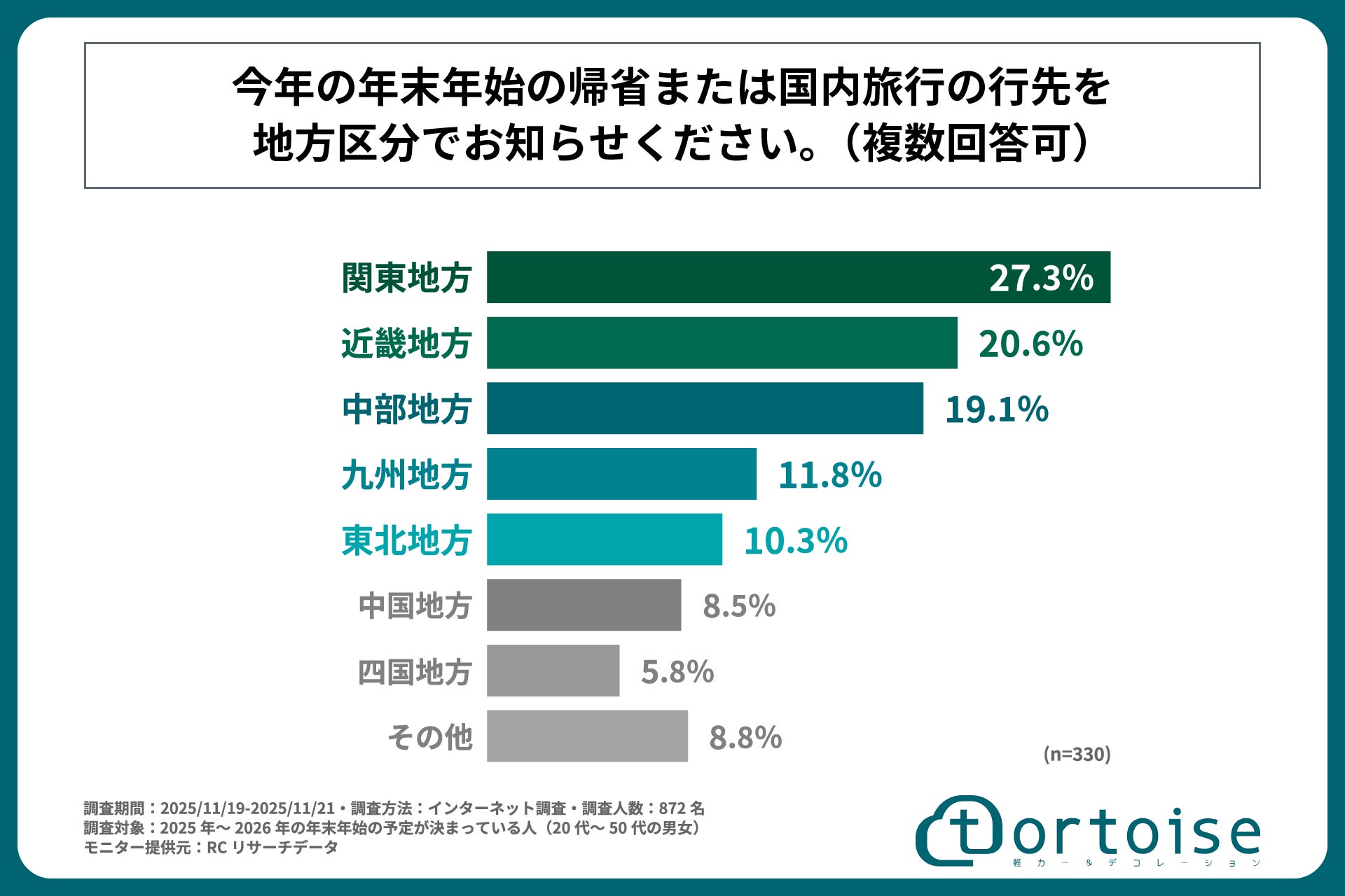 ・2025年~2026年の年末年始の帰省または国内旅行の行先のトップ3は、1位が「関東地方」、2位「近畿地方」、3位「中部地方」