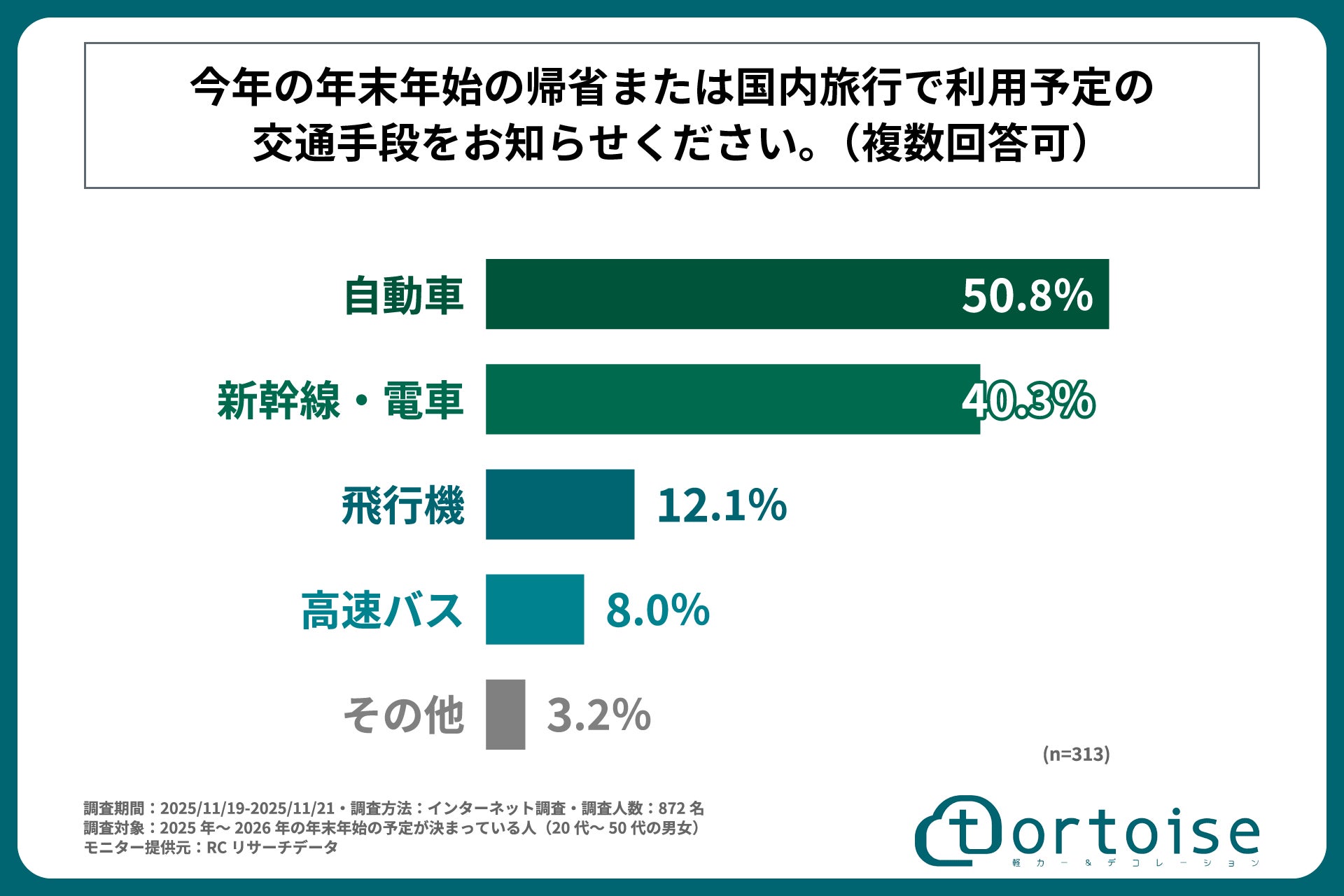 株式会社トータス(本社:神奈川県大和市、代表取締役社長:村野 公紀)が運営する「tortoise」は、今年の年末年始の予定が決まっている人(20代~50代の男女)を対象に「年末年始の過ごし方と交通手段に関する調査」を実施しました。この調査から、2025年~2026年の年末年始の予定が決まっている人の過ごし方やその際に利用予定の交通手段などが明らかになりました。