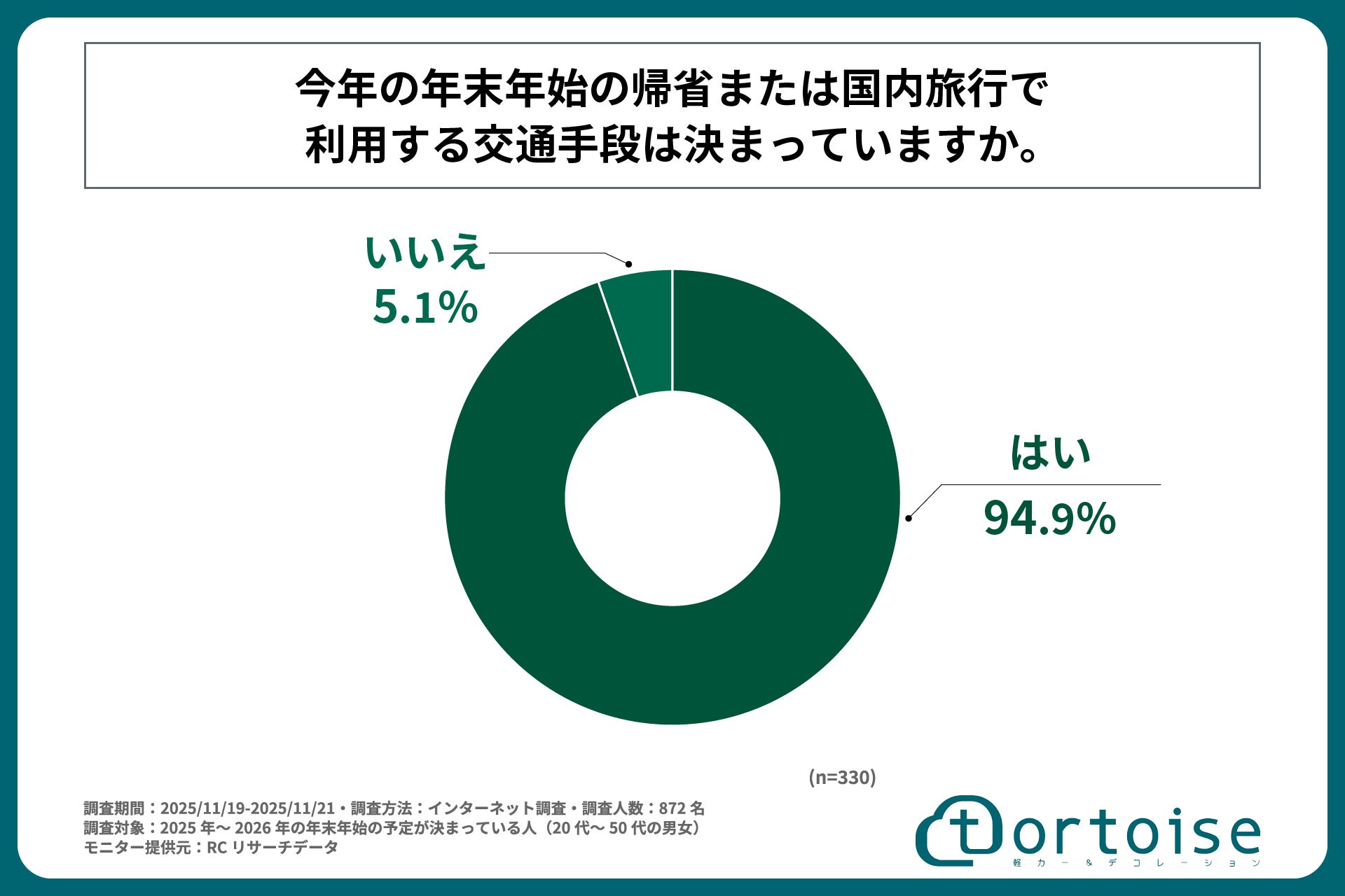 また、2025年~2026年の年末年始の予定を帰省または国内旅行と回答した人を対象に「今年の年末年始の帰省または国内旅行で利用する交通手段は決まっているか」を尋ねる設問への回答では、「はい」が94.9%、「いいえ」が5.1%という結果になりました。この結果から、2025年~2026年の年末年始は帰省または国内旅行を予定している人の約95%が、その際に利用する交通手段も決まっていることが明らかになりました。