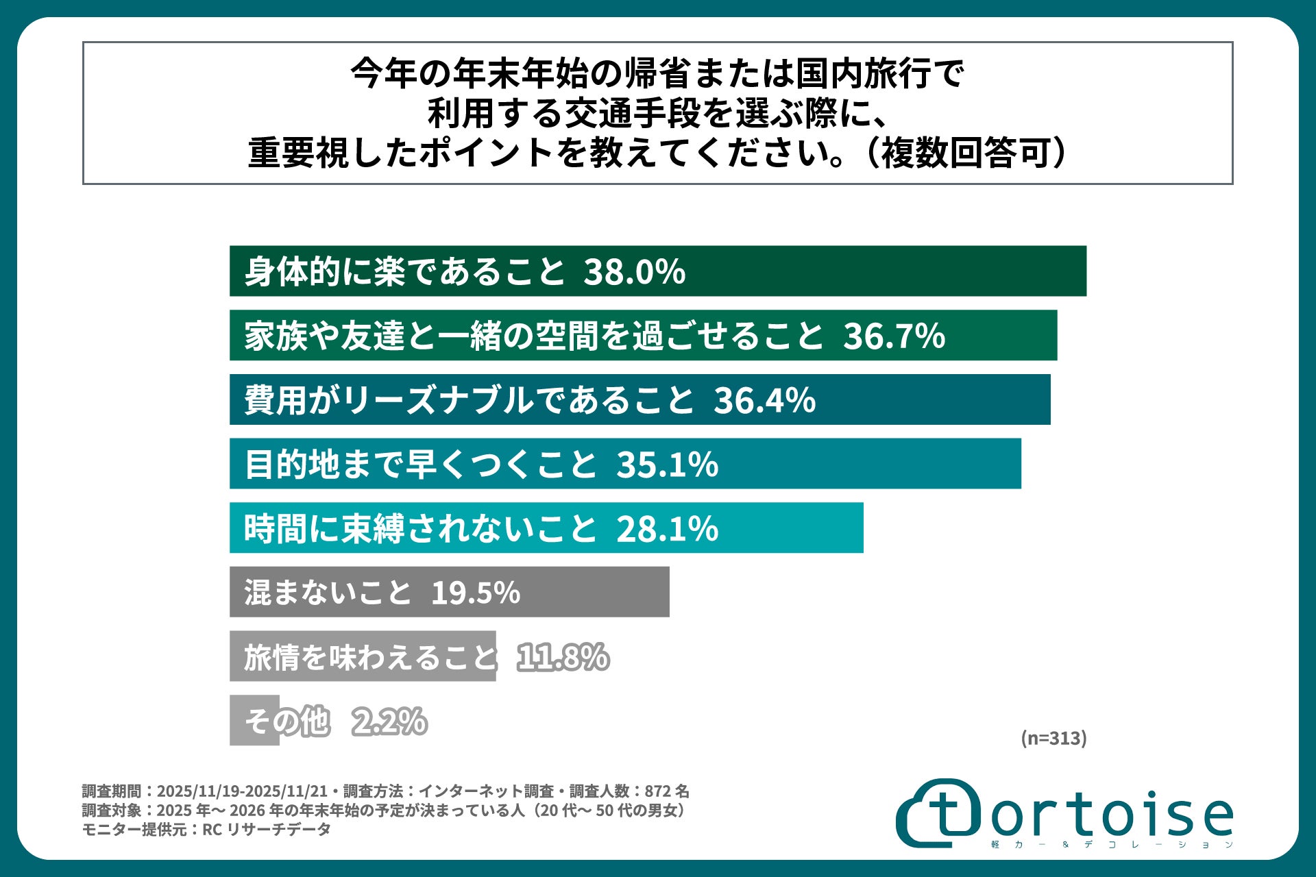 調査の最後、2025年~2026年の年末年始の帰省または国内旅行で利用する交通手段が決まっていると回答した人を対象に「今年の年末年始の帰省または国内旅行で利用する交通手段を選ぶ際に、重要視したポイント」を尋ねる設問への回答では、1位が「身体的に楽であること」で38.0%、2位が「家族や友達と一緒の空間を過ごせること」で36.7%、3位が「費用がリーズナブルであること」で36.4%という結果になりました。この結果から、2025年~2026年の年末年始の帰省または国内旅行で利用する交通手段を選ぶ際に、重要視したポイントは「身体的に楽であること」が最も多いことが明らかになりました。