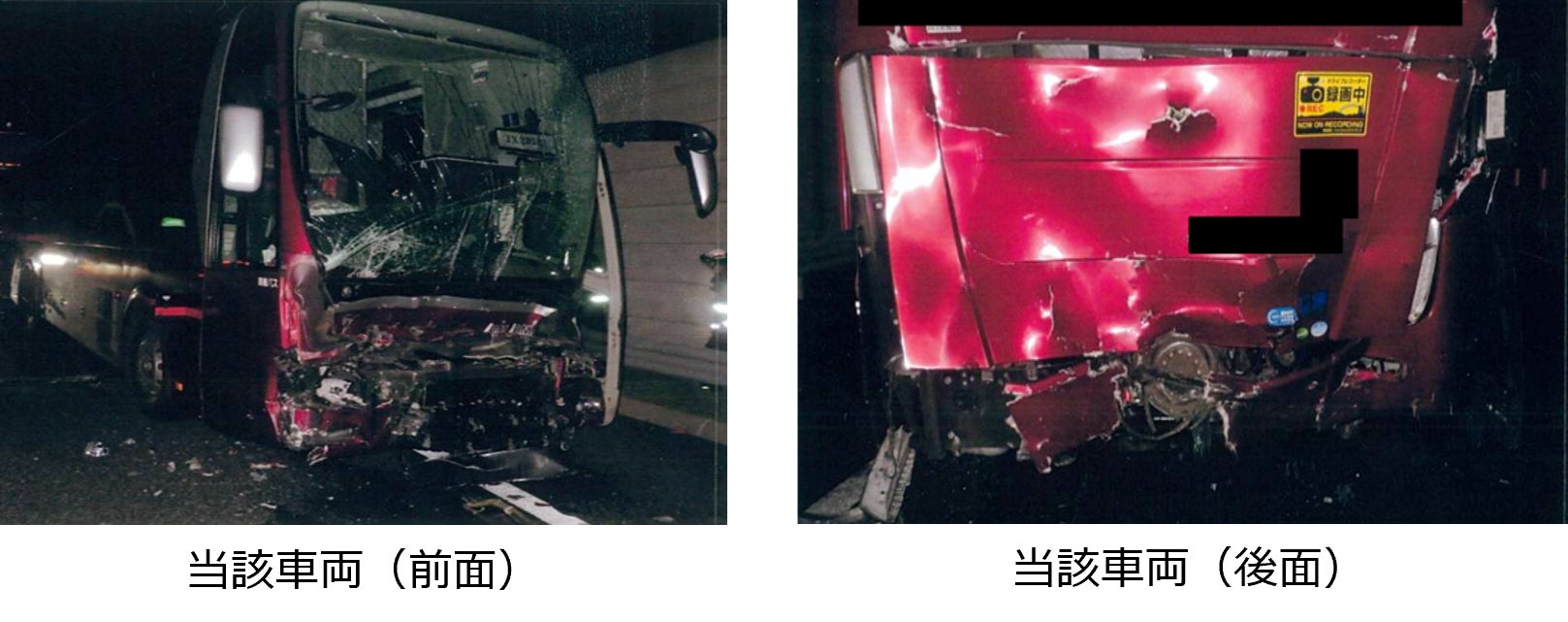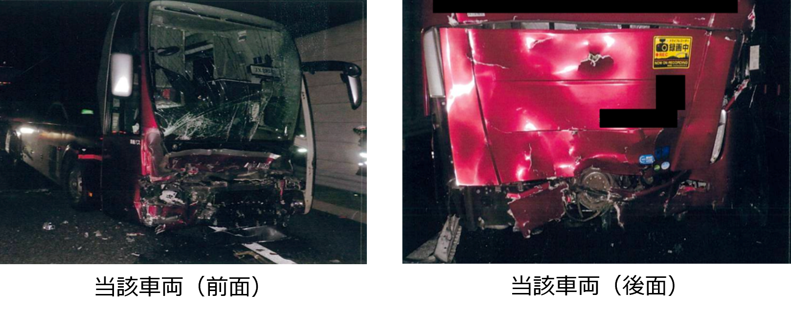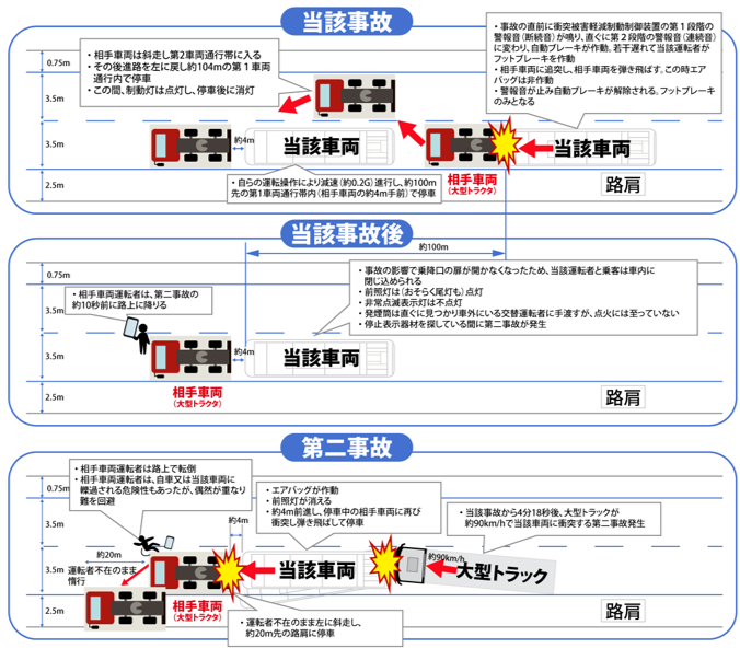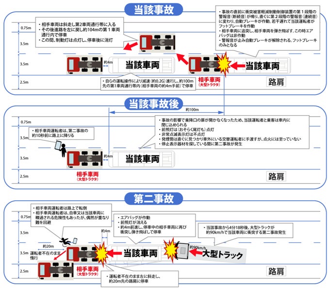その後、バス運転者は、非常点滅表示灯が点灯できなかったことに加え、停止表示器材や発炎筒の設置を怠ったため、第1車両通行帯に停車していた同バスに、後続の大型トラックが衝突する第二事故が発生。