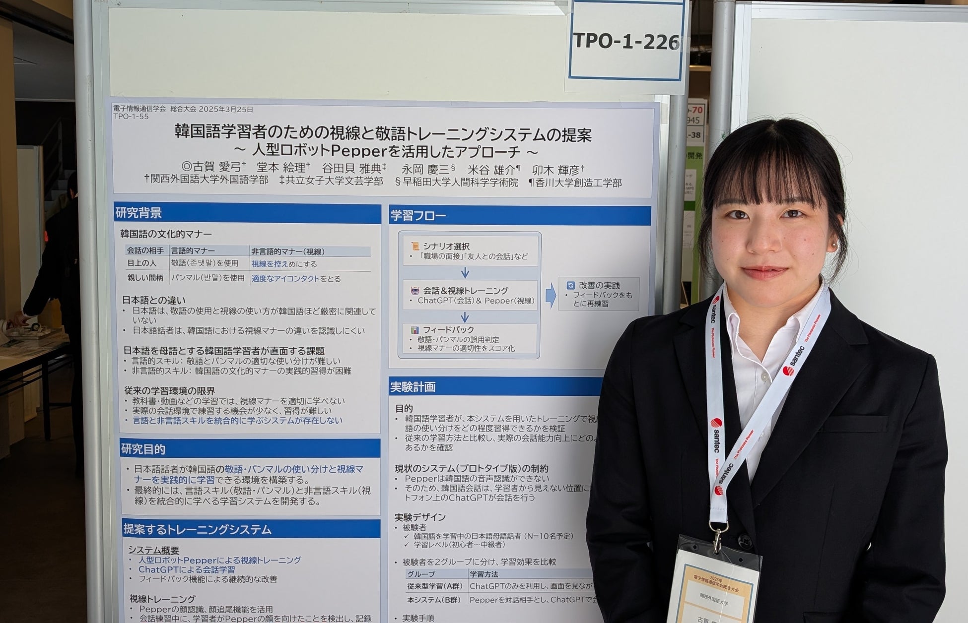 関西外国語大学(大阪府枚方市)外国語学部(英語&デジタルコース)の学生が東京都市大学で3月24日から5日間開かれた電子情報通信学会総合大会で生成AIを利用した語学学習システムの研究成果を発表しました。