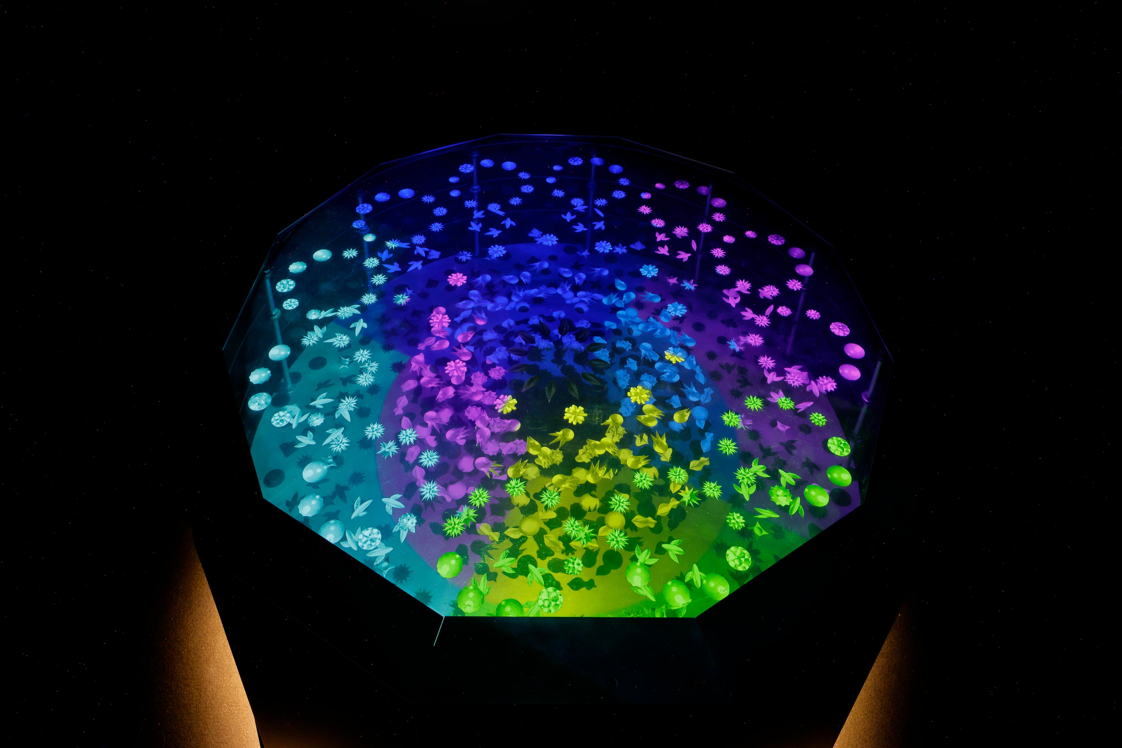 会場には約100点のアイテム、50種類以上の「ぐるぐる」の世界が集結。20名を超えるアーティストやクリエイターの作品、社会や歴史の資料などを、音声ガイドのキャラクター「UZU(ウズ)」と「メグル」の導きで巡ります。