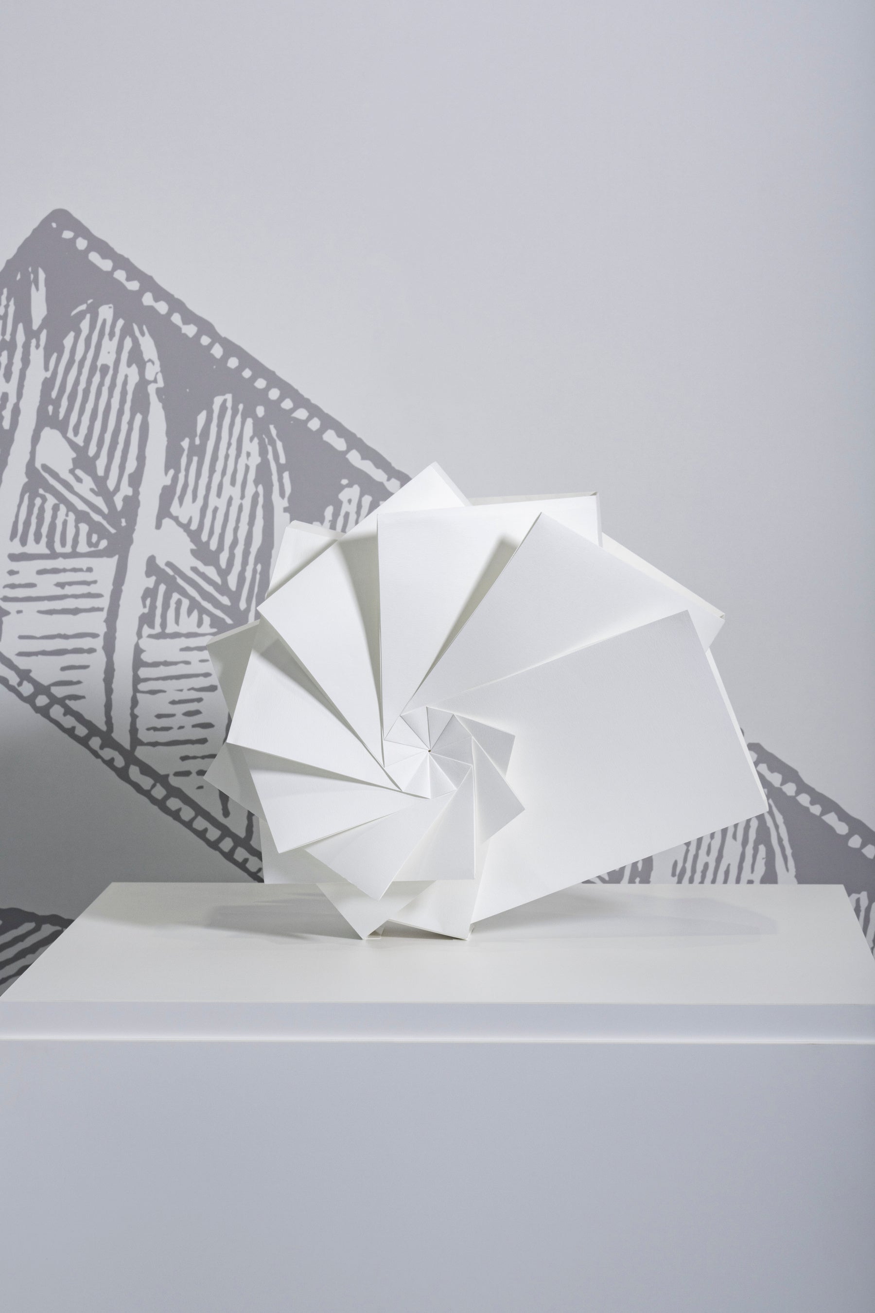 作家紹介:コンピュータグラフィックスの領域から折り紙研究を行う。本展のために3種類の「ぐるぐる」形状を過去最大サイズとなる高さ60〜80cmほどで制作。