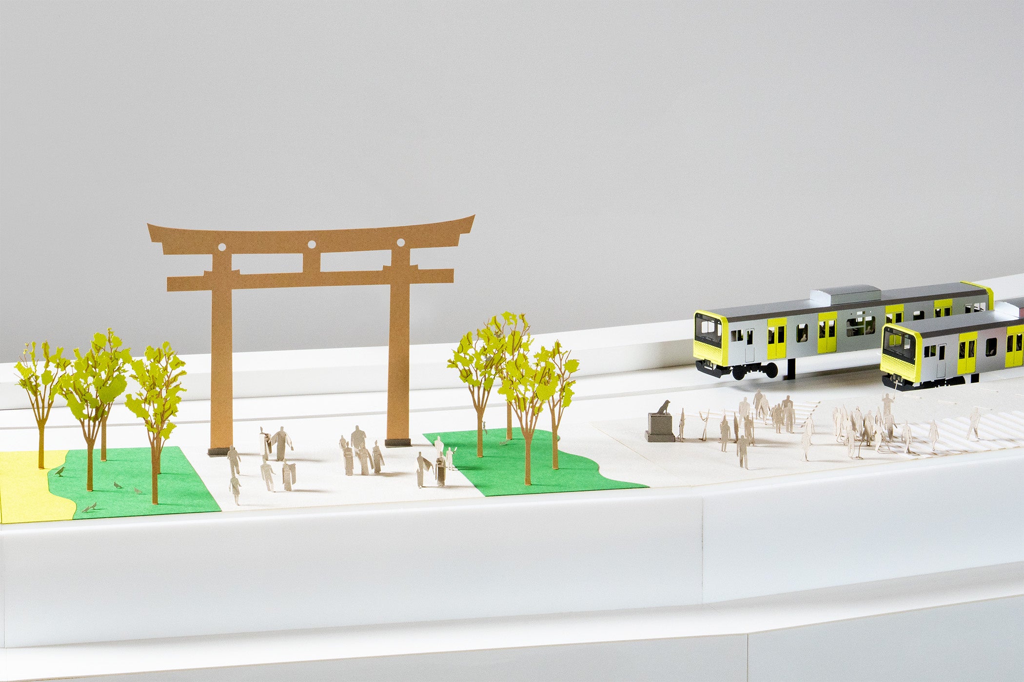 「1/100建築模型用添景セット」シリーズで人気のテラダモケイが山手線沿線をデザイン。紙の電車を動かすのは国内外の多くのプロジェクトで装置設計製作を手掛けてきたTASKOとGakki Lab.。
