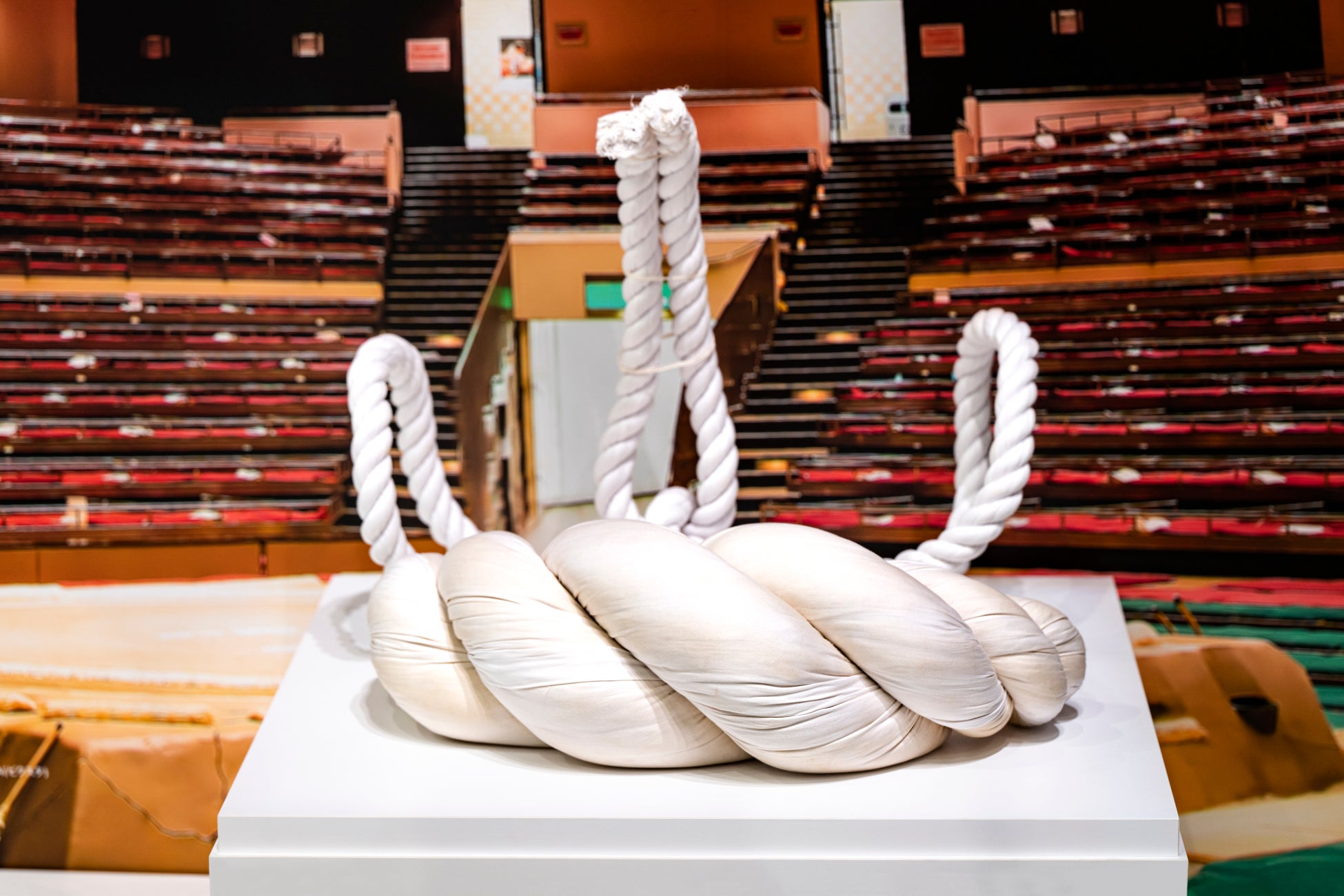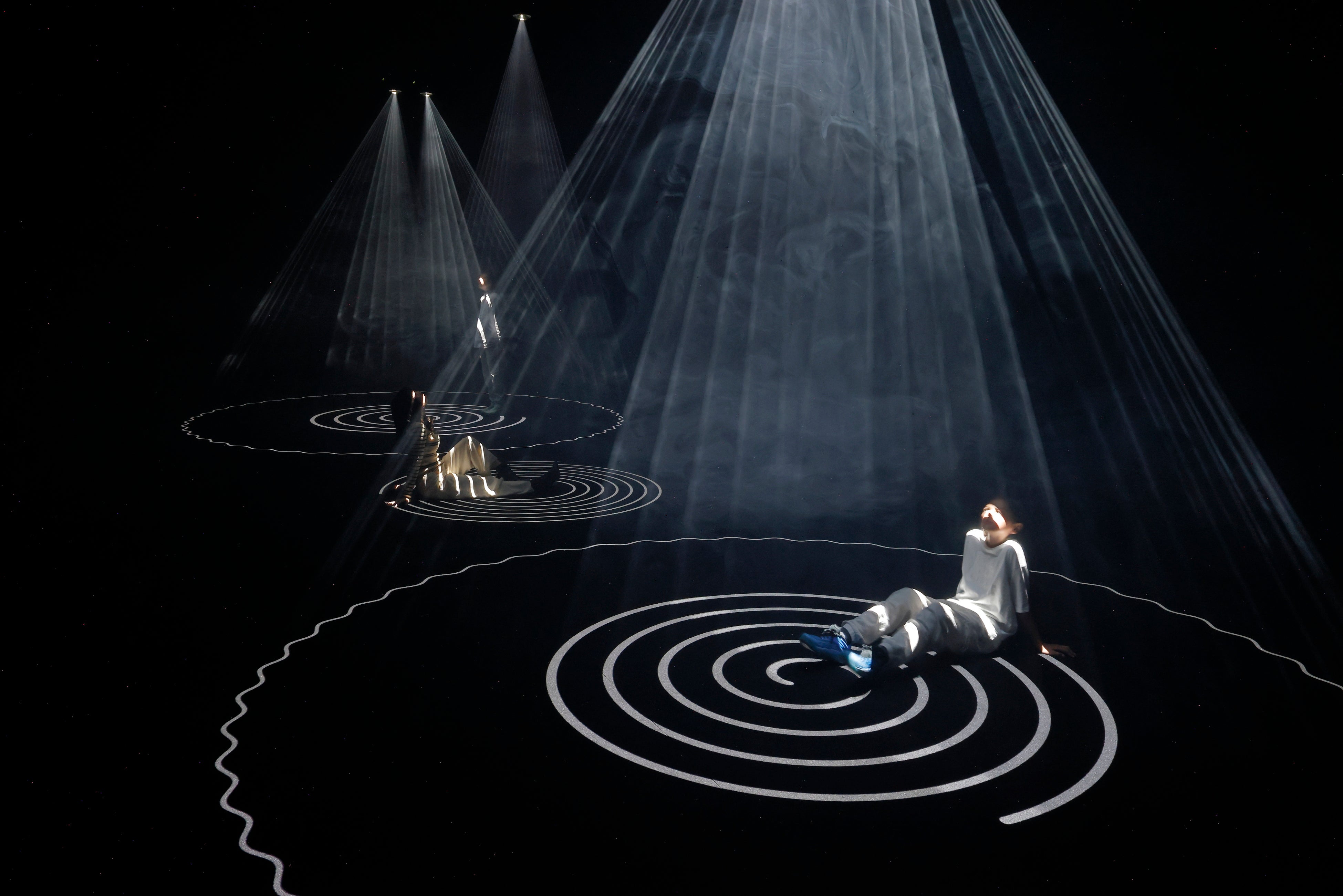 世界中には、らせんや円の形をした「ぐるぐる建築」が多数存在する。大屋根リングは「多様でありながら、ひとつ」という理念のもと大阪・関⻄万博のシンボルとして設計されたもの。本展では1/200サイズの模型を天井に浮かべ、今までにない大屋根リングの構造を下から見ることができ、ひとつの空を共に見上げる体験が想起される。