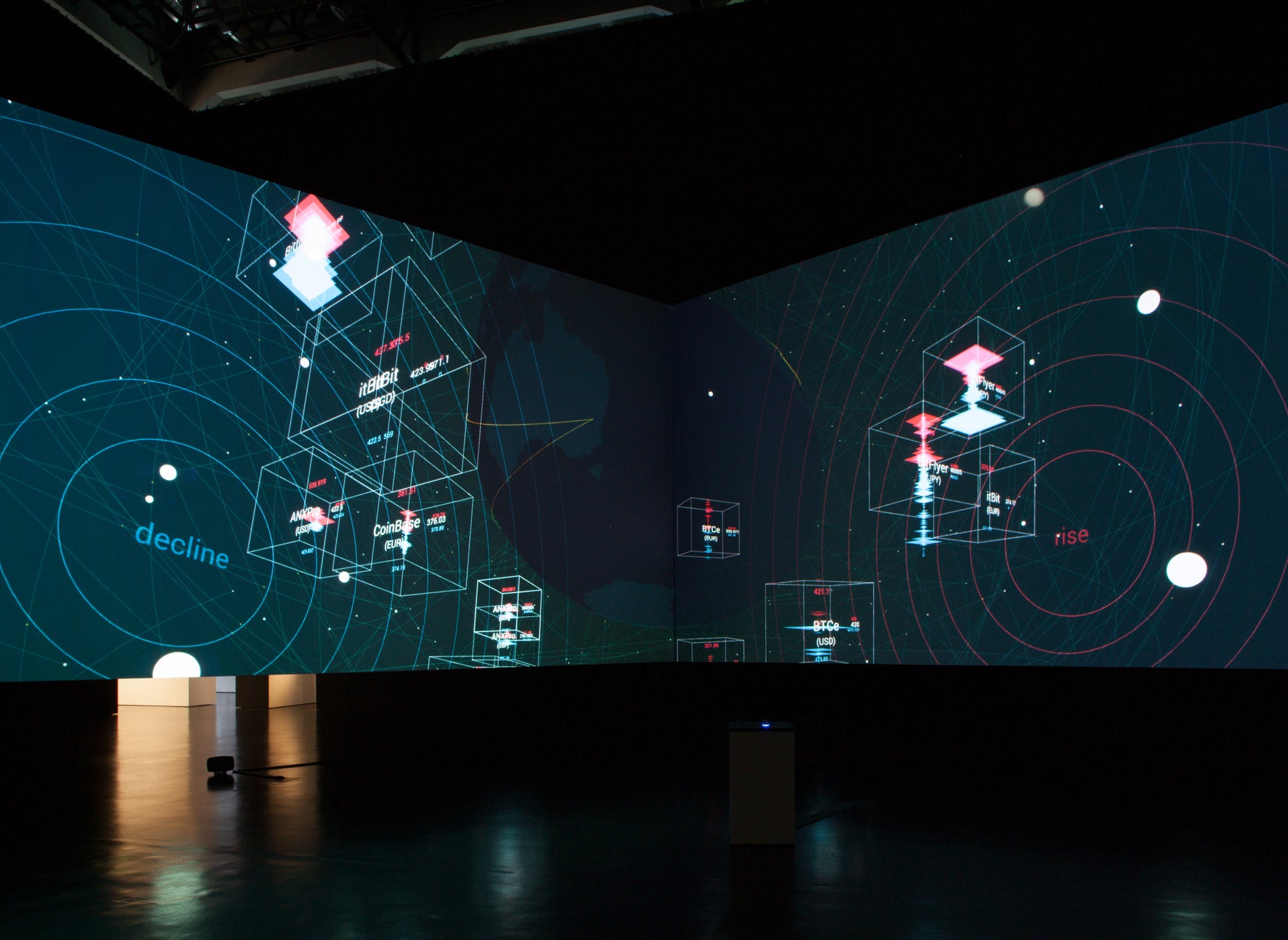 Bjork、Arca、坂本龍一、Perfumeらとのコラボレーションでも知られる真鍋大度が登本悠介、石井2bitとともに制作。2013年に自ら株式市場の自動取引システムを構築し、2016年にはビットコインの取引ロジックを設計・実装。その挙動を可視化することで、AIが一般化する以前から、意思決定の自動化とその不可視性を扱った作品。