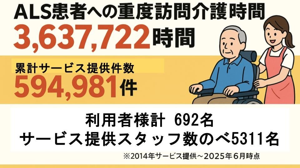 ALS(筋萎縮性側索硬化症)など重度障害・難病患者に在宅介護サービスを提供する株式会社ユースタイルラボラトリー(本社:東京都中野区、代表取締役:大畑健)は、6月21日の「世界ALSデー」に際し、2025年6月時点でALS患者様への重度訪問介護サービス提供時間の合計が3,637,722時間、累計サービス提供回数594,981件、692名のALS患者の方にサービスを提供してまいりましたことをお知らせします。