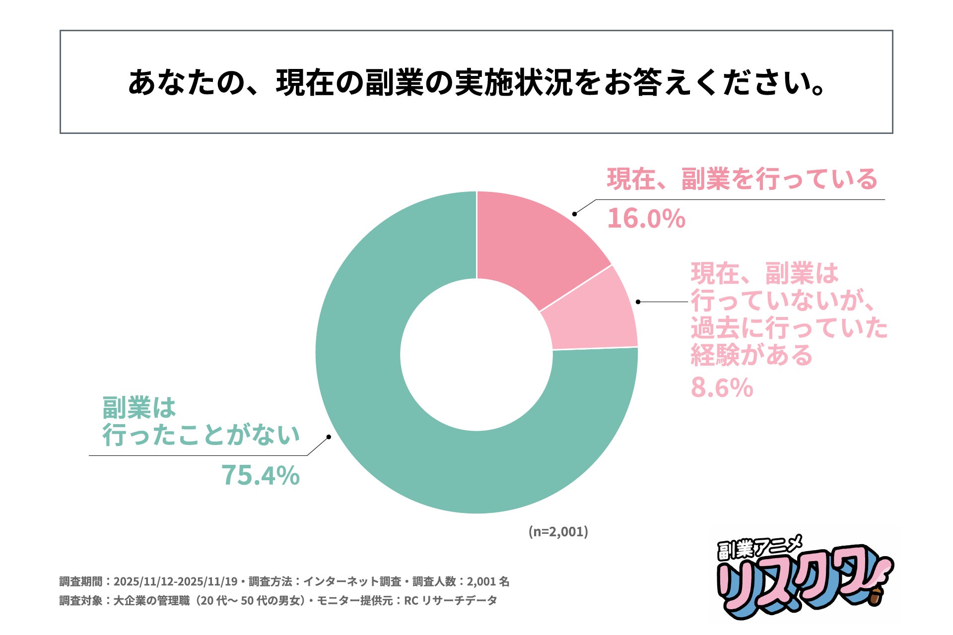 大企業の管理職の約25%が、現在副業を行っている、または副業を行った経験がある