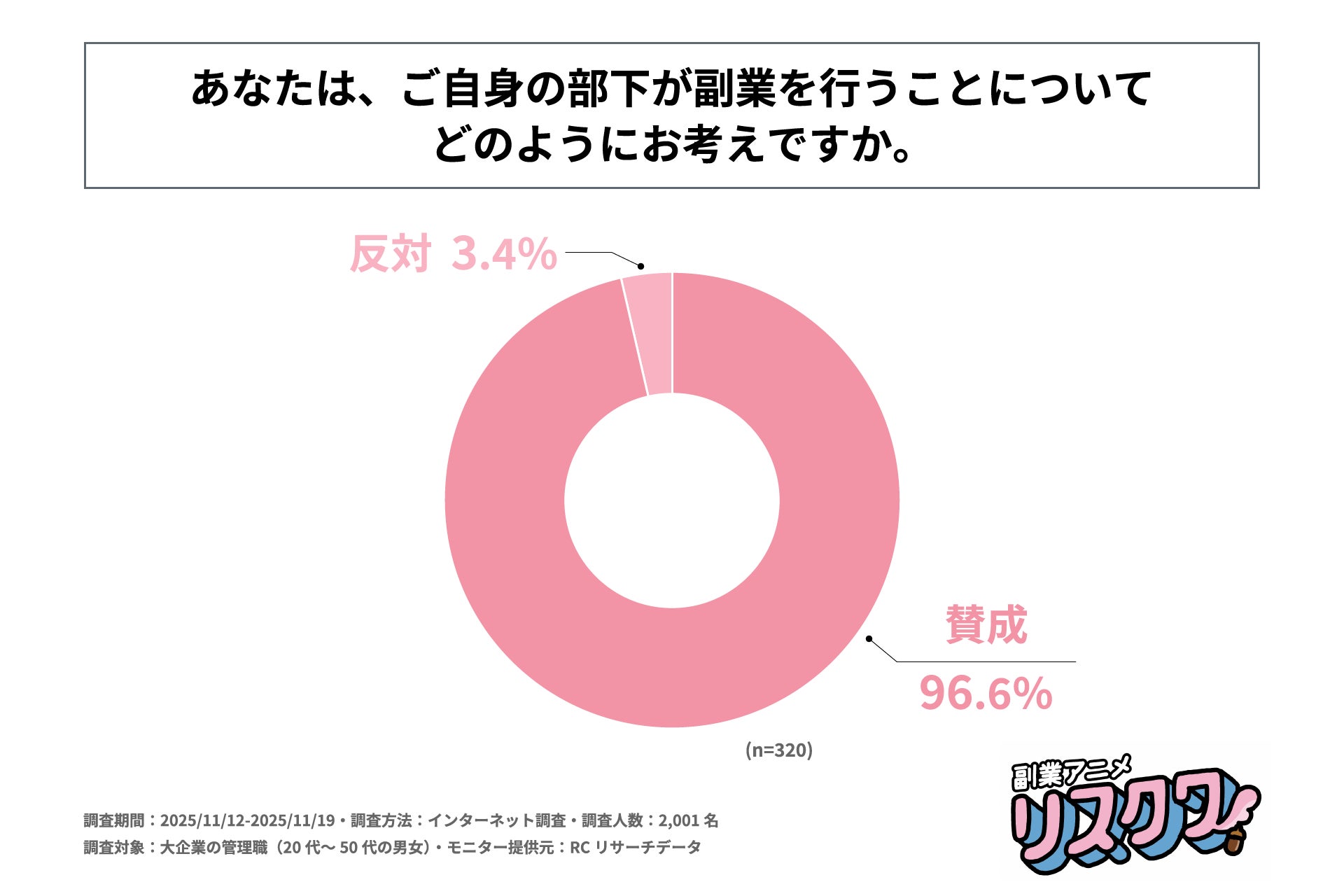 調査の最後、現在副業を行っていると回答した人を対象に「自身の部下が副業を行うことについてどのように考えるか」を尋ねる設問への回答では、「賛成」が96.6%、「反対」が3.4%という結果になりました。この結果から、現在副業をしている大企業の管理職の95%以上が、自身の部下が副業を行うことについて「賛成」であることが明らかになりました。