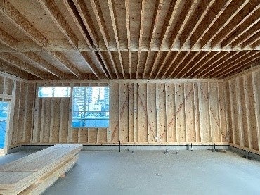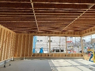 店舗棟は間口4.2m、奥行き6.9mの事務スペースと間口5.6m、奥行き9.2mの商談エリアがあります。備品レイアウトや動線を考慮する上で自由度がもてるように無柱空間での構造検討を行いました。一般的な木構造では6m以上の無柱空間を確保するのは困難ですが、今回はTJIジョイスト(以下、TJI)という木製I型ビームを採用しました。TJIは鉄骨のI型鋼と同じようにI型の断面形状となっていて、フランジ部分はLVL、ウェブ部分はOSBで構成されています。軽量で作業性が良く、また高い強度があるので、大空間の屋根材に適しています。このTJIを6.9m部分では910㎜ピッチ、9.2m部分では303㎜ピッチで配置することで無柱空間を実現しました。
