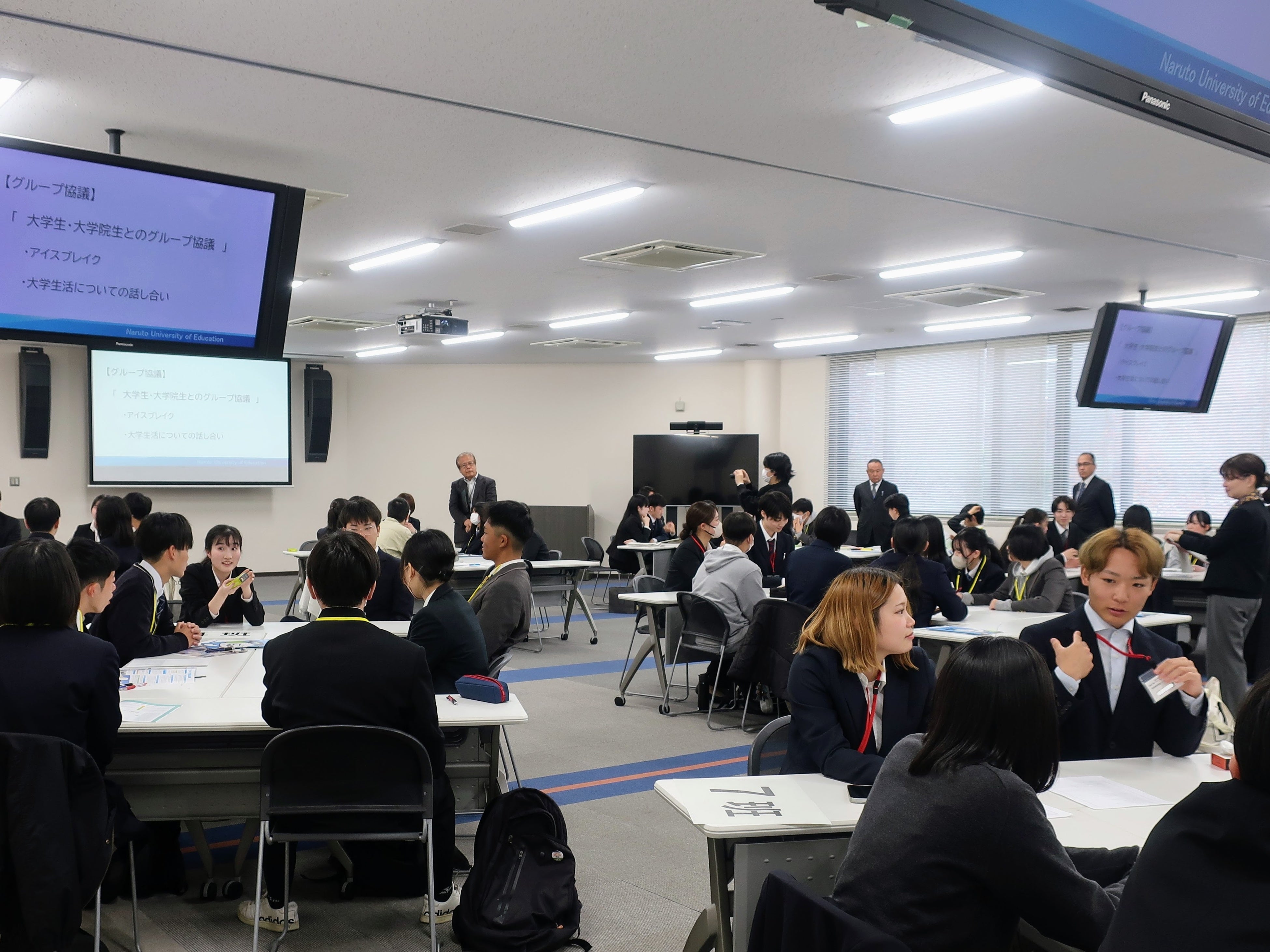 また、学校教育学部学校教育実践コースと教職大学院教員養成特別コースの現役学生も参加して、大学での学びや大学生活等について話し合うグループ協議を行いました。