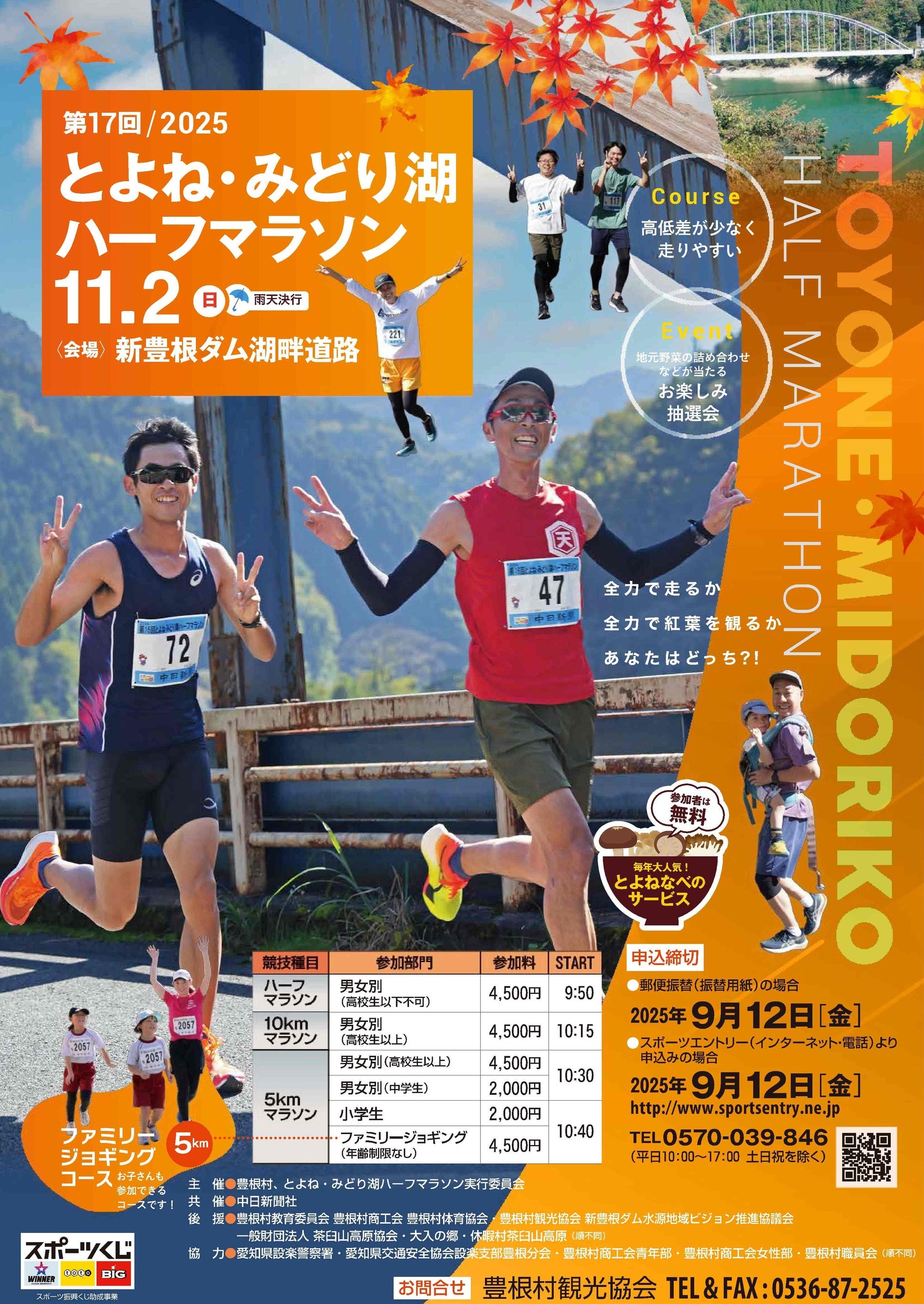 豊根村では、紅葉の名所・みどり湖を舞台に「第17回 とよね・みどり湖ハーフマラソン」を2025年11月2日(日)に開催いたします。エントリー期間は8月1日(金)~9月12日(金)です。
