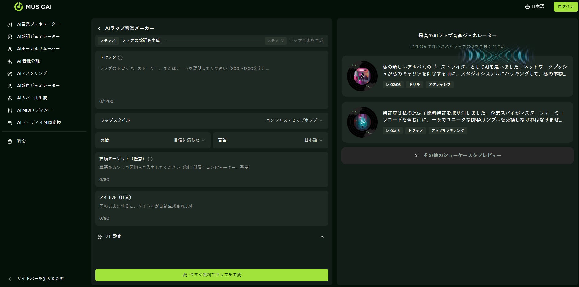 ユーザーメリット: 制作難易度の高いヒップホップジャンルにおいても、専門的なライミングスキルや録音環境なしに、本格的なラップ楽曲を制作できます。
