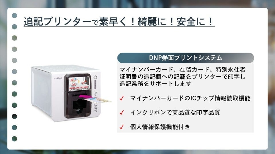 IDSは、240団体以上、累計700台以上の自治体に「DNP券面プリントシステム*3」を導入してきました。本システムは、マイナンバーカード等の住所・氏名変更といった追記業務を支援し、以下の特長で繁忙期の窓口業務を強力にサポートします。