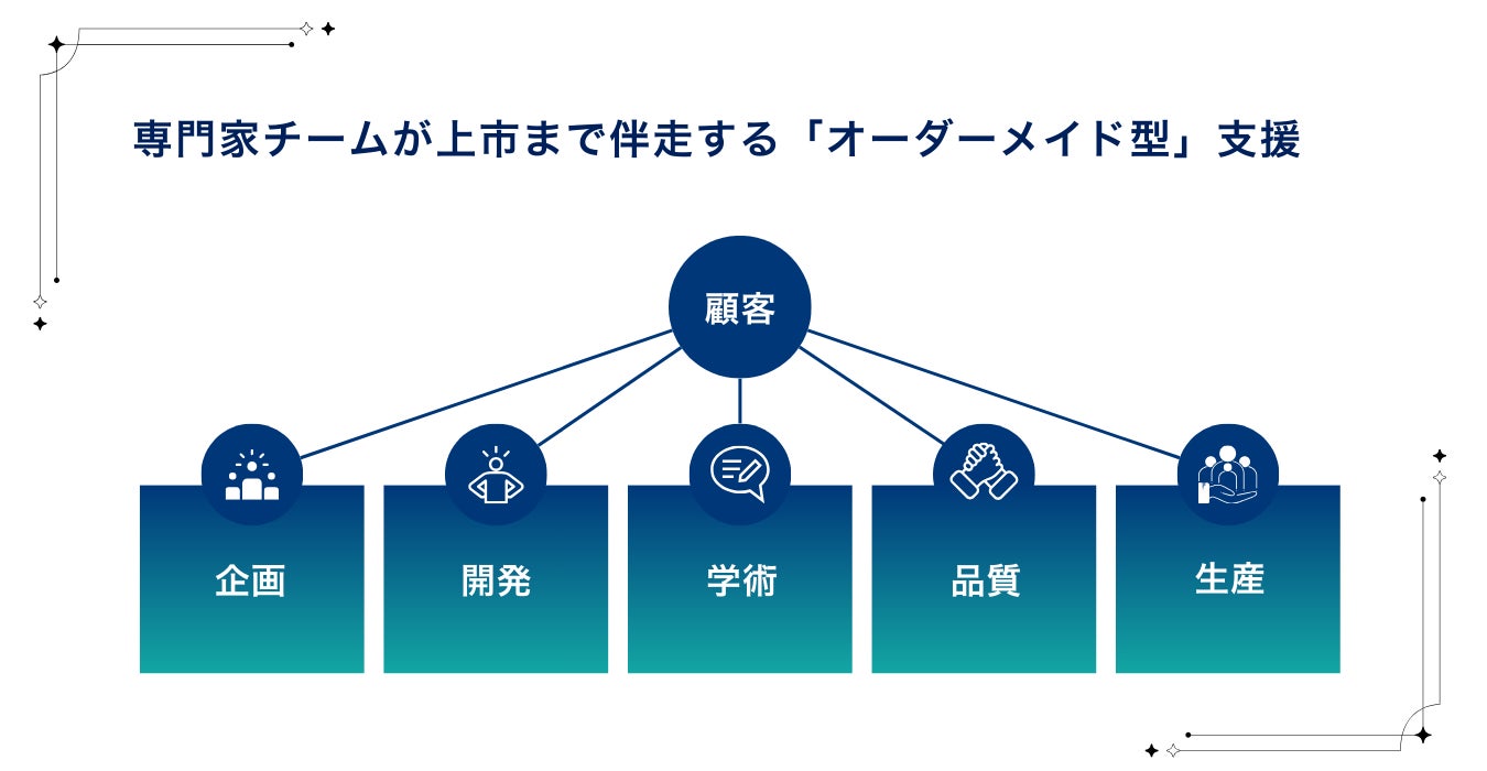 ▷ 顧客ごとに専門家チームがアイデア段階から上市まで伴走する 「オーダーメイド型」支援