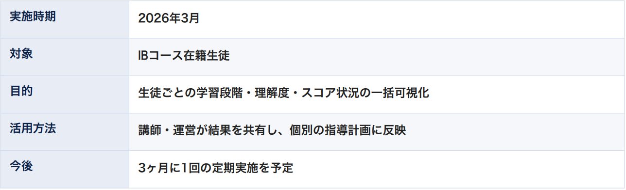 IBアカデミーは今後、合同実力テストを定期的に実施し、生徒一人ひとりの成長を継続的にトラッキングしていく予定です。テスト結果をもとに講師・運営が連携し、苦手科目への早期対応や学習計画の最適化を図ることで、IBスコアの向上と志望校合格をより強力にサポートしてまいります。 引き続き、生徒様一人ひとりに寄り添った高品質な指導環境の整備に努め、IB専門家庭教師サービスとしての価値向上に取り組んでまいります。