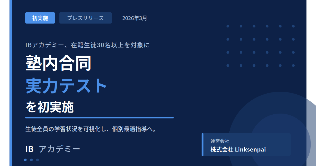 株式会社Linksenpai(所在地:東京都渋谷区、代表取締役:吉田志織)が運営するIB(国際バカロレア)専門 オンライン家庭教師サービス「IBアカデミー」は、2026年3月、IBコースに在籍する生徒を対象とした塾内合 同実力テストを初めて実施しました。各生徒の現在の学習段階・理解度・スコアの状況を一括で可視化。講師 が生徒一人ひとりに最適な指導を提供できる体制をさらに強化します。
