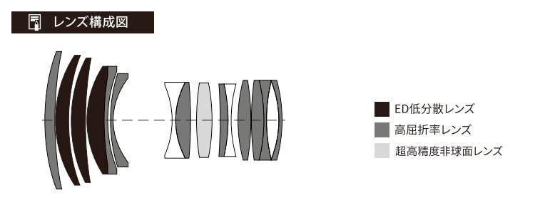 ・11群15枚(ED×3、非球面×1、高屈折率×9)の贅沢な光学設計