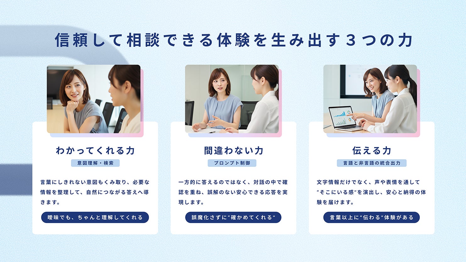 また、企業ごとのブランドトーンに合わせたアバターや音声のカスタマイズ機能、既存SaaSやCMSとのAPI連携による導入支援も強化。AIを単なる問い合わせ窓口ではなく、“企業の人格”としてユーザーと関係を築く対話設計へと発展させます。