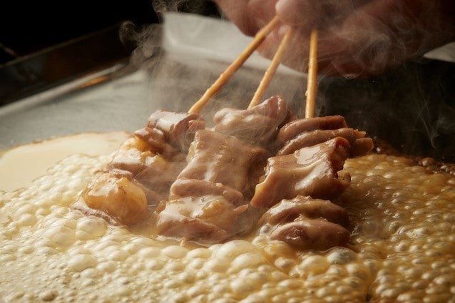 お客さまから注文をいただいてから1本ずつ鉄板で焼き上げ、白味噌をたっぷりとかけてご提供いたします。
