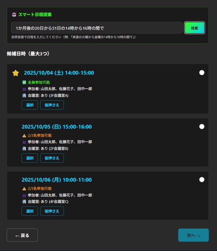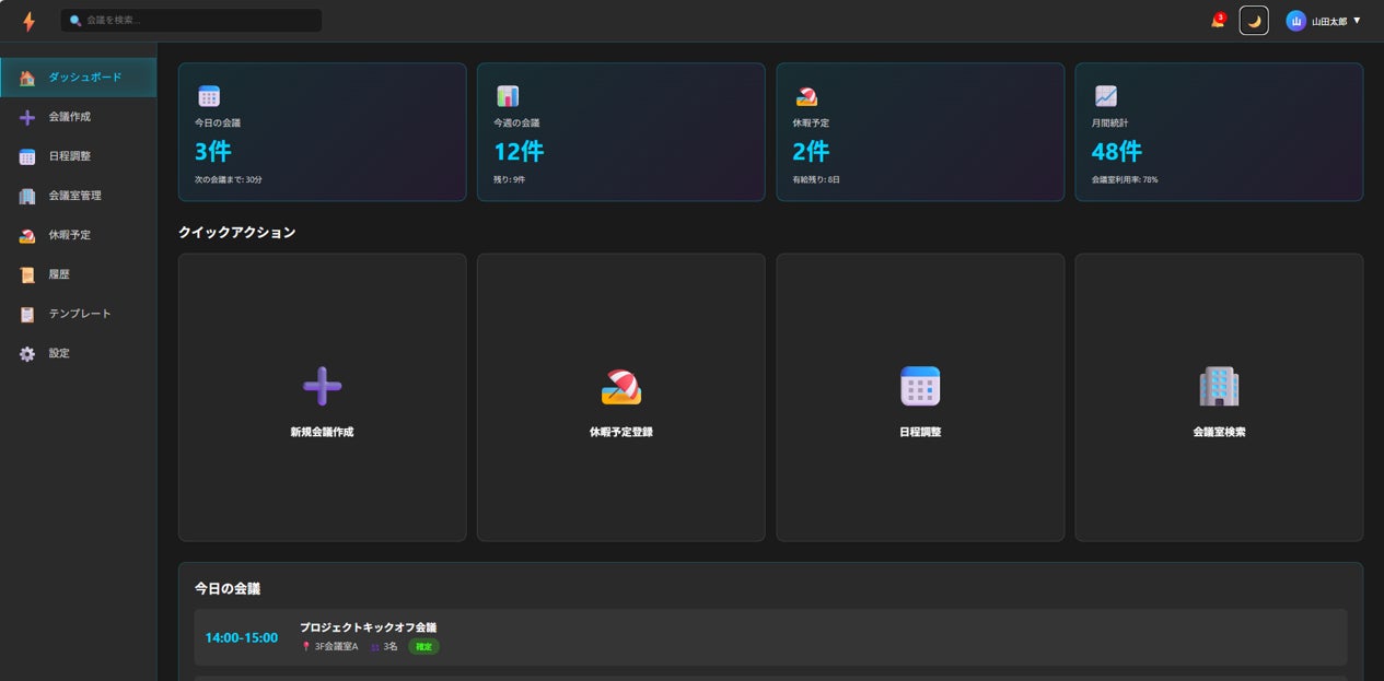 高機能な会議予約システムを構築し、組織内の会議調整業務を効率化 有給情報登録やタスク管理など想定した拡張性・汎用性をもった機能 |