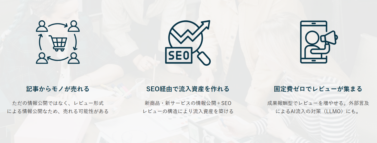 成果報酬型でレビューを増やせる。外部言及によるAI流入の対策(LLMO)にも活用可能です。