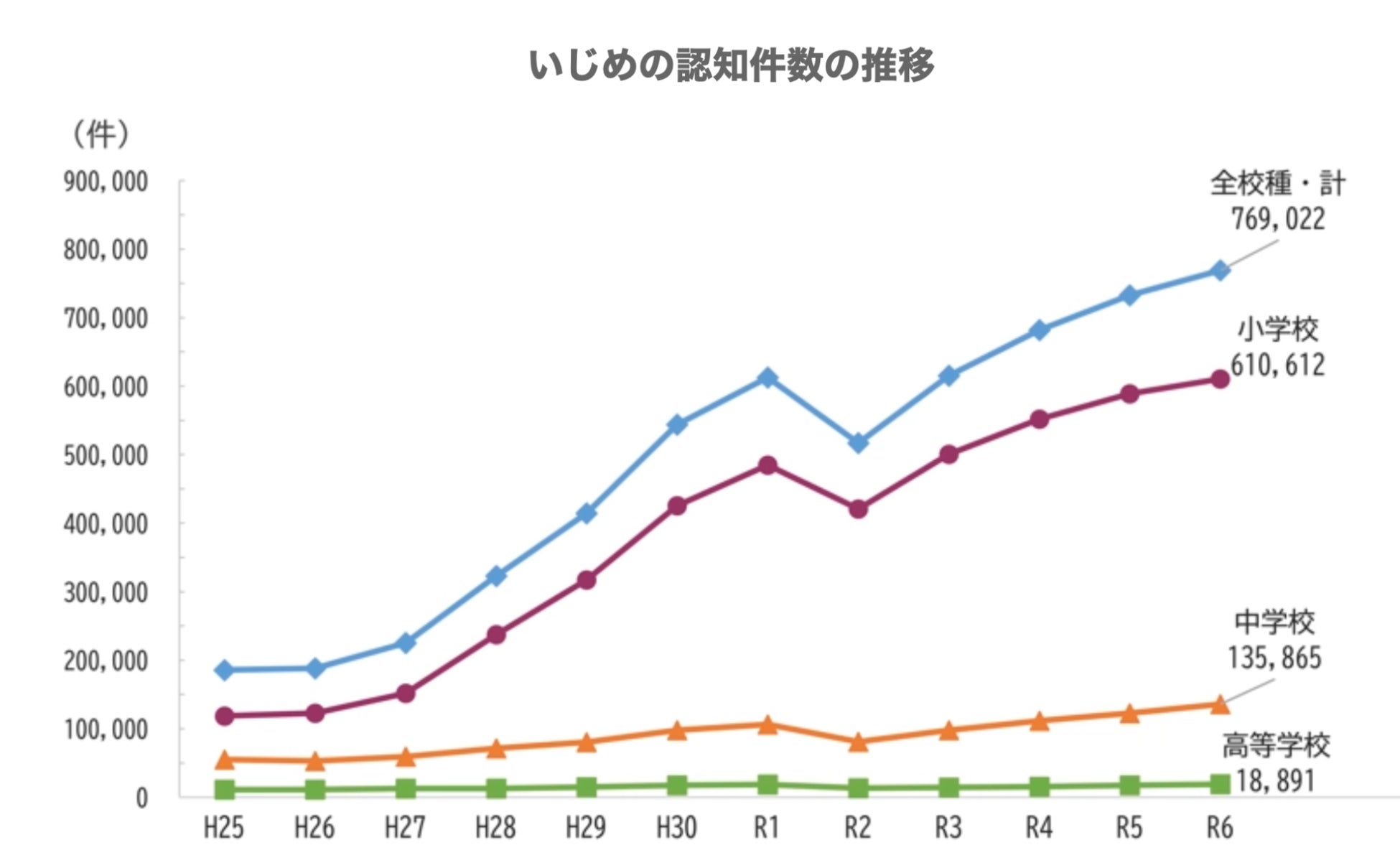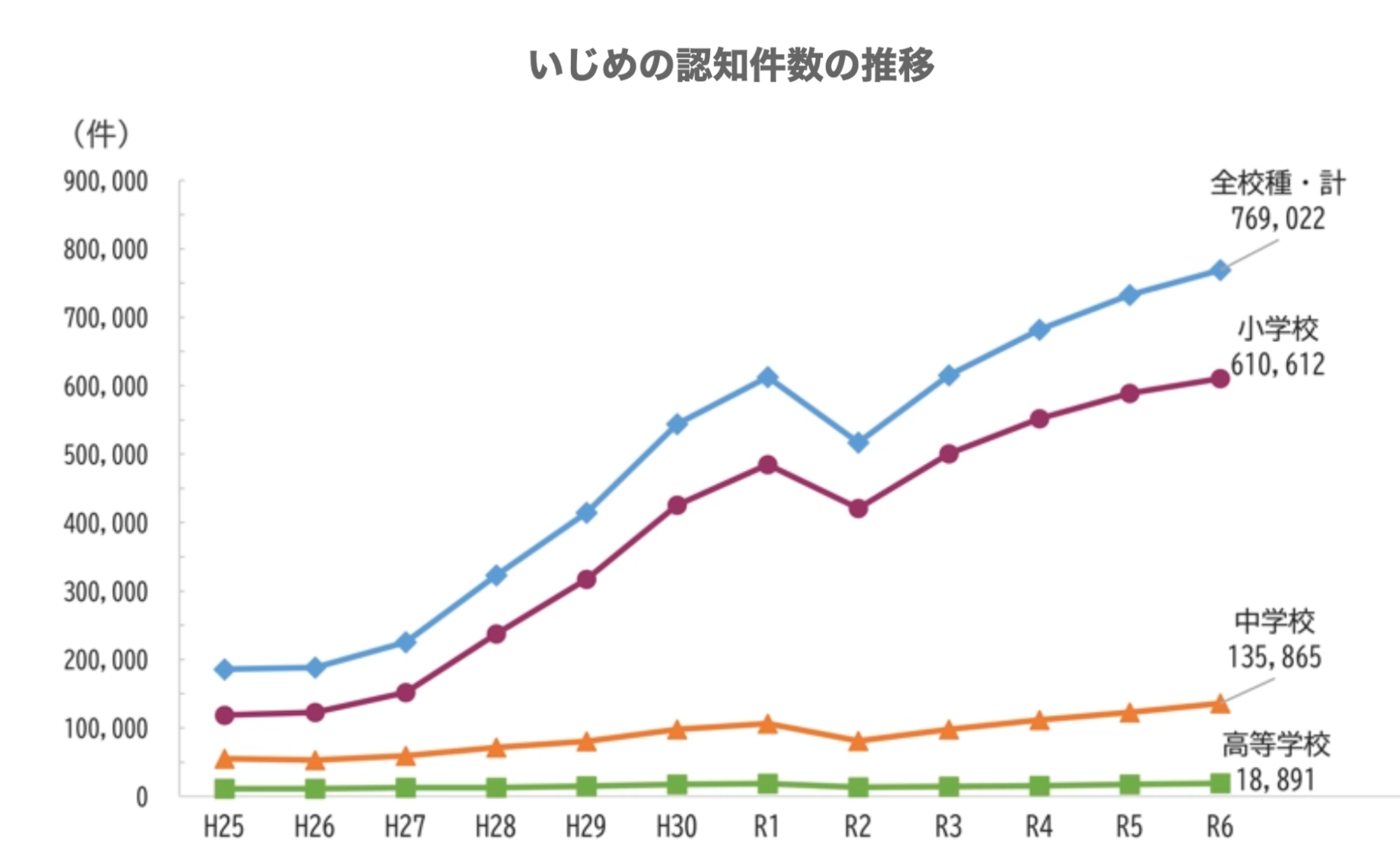 また、文科省によるといじめの認知件数も2024年度に過去最多を更新しています。