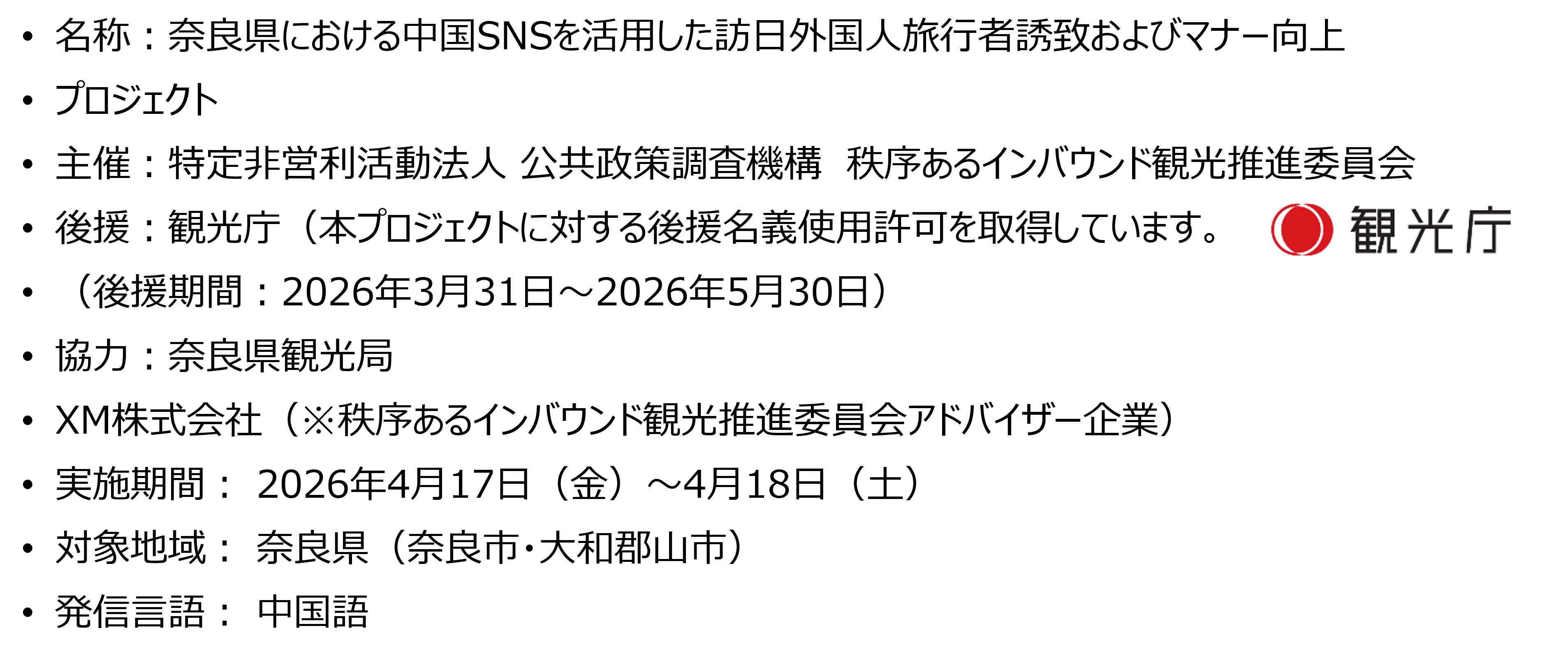なお第4弾となる奈良県プロジェクトは、「奈良県における中国SNSを活用した訪日外国人旅行者誘致およびマナー向上プロジェクト(後援期間:2026年3月31日~2026年5月30日)」として、観光庁の後援名義使用許可を取得しています。