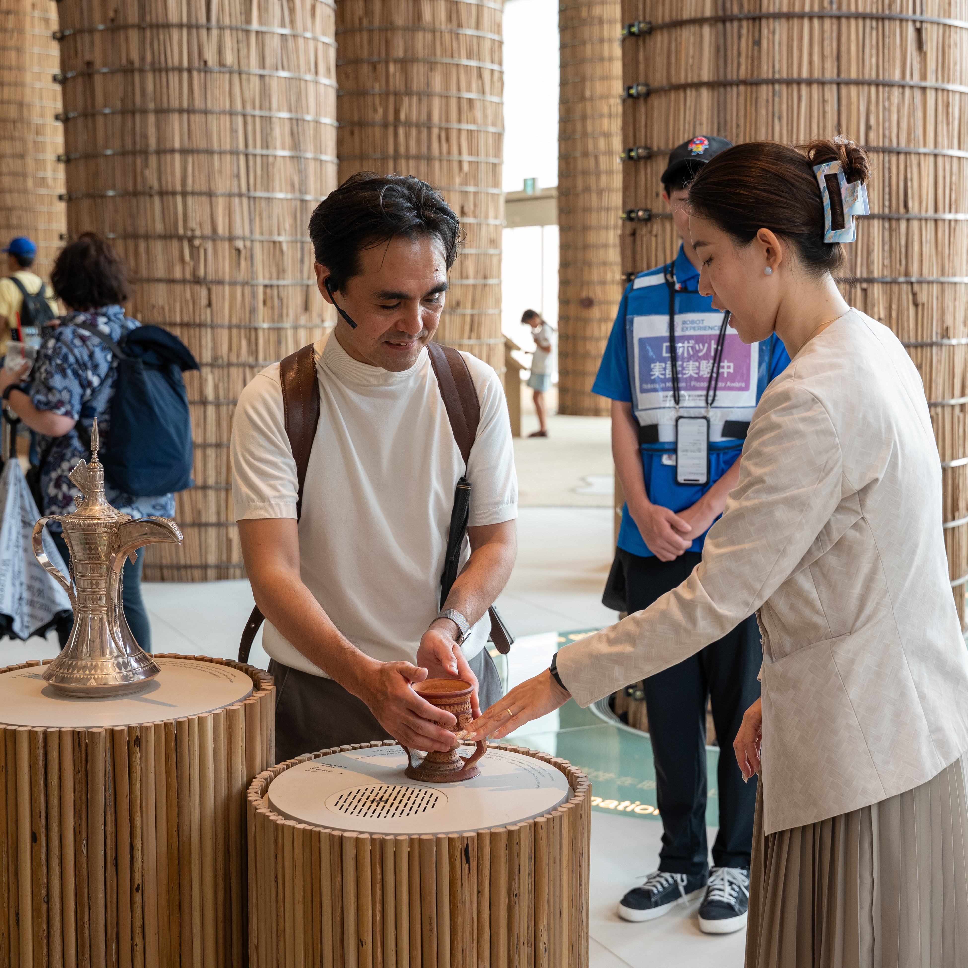 パビリオンの建築は、UAEを象徴するナツメヤシの木に着想を得て、伝統的なエミラティ建築様式「アリーシュ」を再解釈したものです。ナツメヤシの農業廃棄物と日本の匠の木工技術を融合することで、UAEと日本の文化が協働の精神のもとに結びついています。