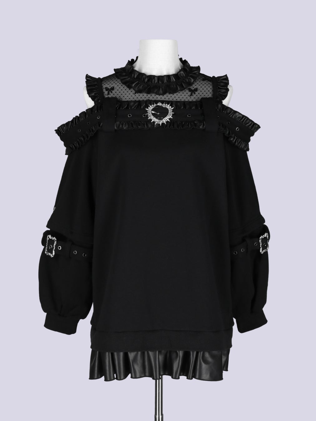 硬質なレザーの緊張感と、幾重にも重なるフリルの甘さ。