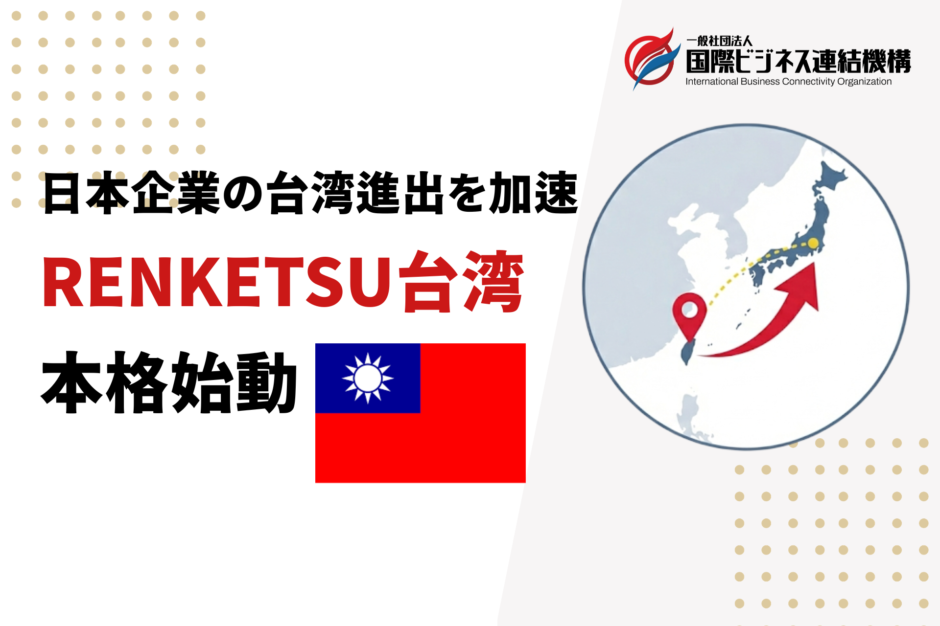 日本企業の海外進出を「知識・人脈・きっかけ」の3つの軸で支援する一般社団法人 国際ビジネス連結機構(所在地:東京都港区、代表理事:松浦啓介)は、2026年1月、国際ビジネス連結機構の台湾支部「RENKETSU台湾」を設立したことをお知らせします。