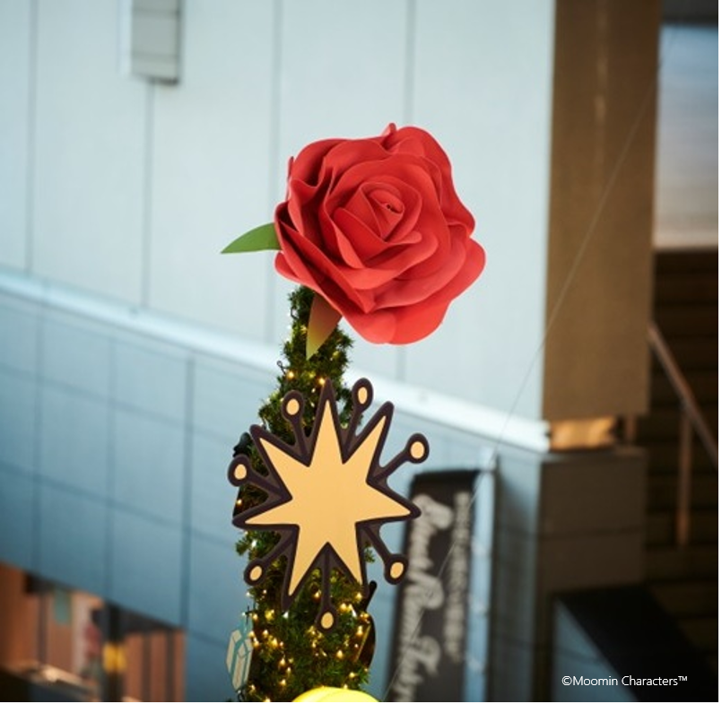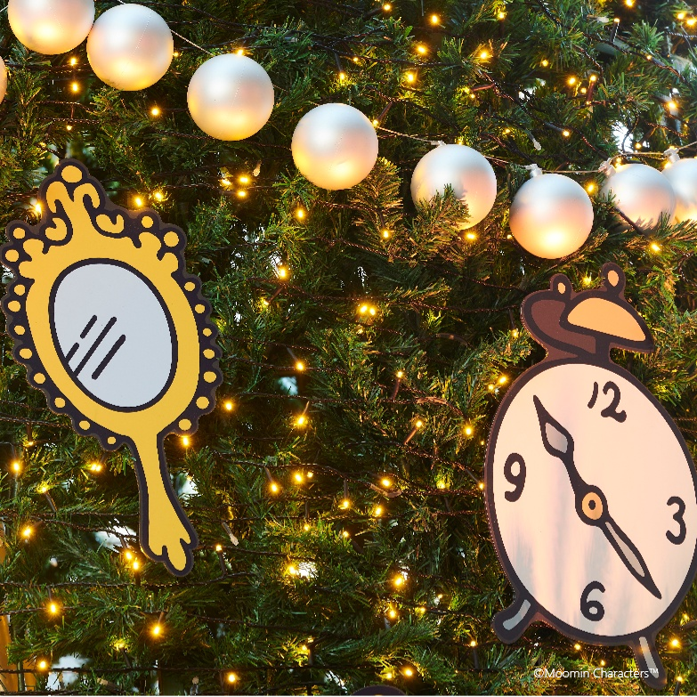 オーナメントには、ムーミンの仲間たちの“とっておき”のものをデザインしました。クリスマスツリーの一番上には、ムーミンママがムーミンパパからもらった赤いシルクのバラを飾り、ムーミンパパがいつもかぶっている帽子、ムーミンママが持ち歩いているハンドバッグ、スノークのおじょうさんの手鏡など、物語に登場するさまざまなモチーフでデコレーションしています。自分にとっての大切な“とっておき”は何か考えるきっかけになるような、特別なクリスマスツリーです。