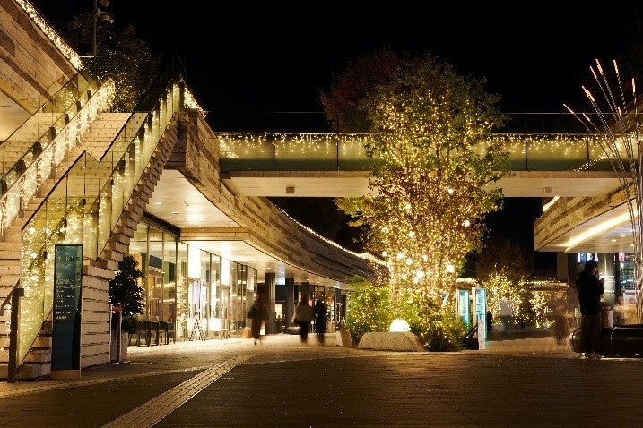 二子玉川ライズ リボンストリート、オークモール、バーズモール、大階段に灯るウィンターイルミネーションは、シャンパンゴールドを基調とした温かな光が二子玉川ライズの街並みを彩ります。