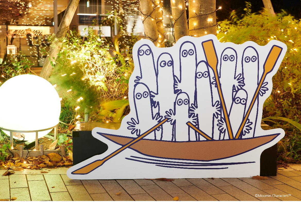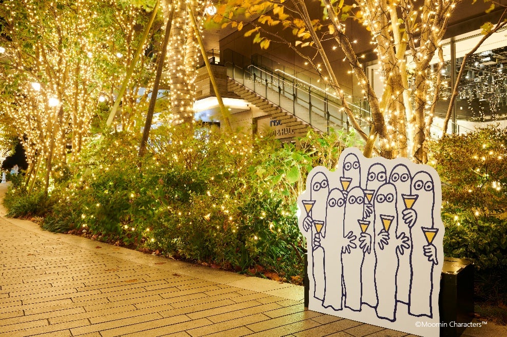 屋外各所では、シャンパンゴールドの柔らかい光に包みこまれる約6.4万球のLEDライトで灯すウィンターイルミネーションが点灯。約60匹のニョロニョロが描かれた「ニョロニョロ発生スポット」は、全4種類のデザインで来街者をムーミンの物語の世界へ誘います。
