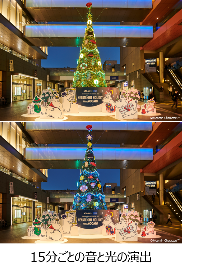 また、ツリー点灯中は、15分ごとに色鮮やかな光で「ムーミン」の物語を表現した音と光の演出を実施します。冬一色のムーミン谷に突如訪れた「クリスマス」の知らせを受けて、 クリスマスを知らないムーミンが仲間たちと手探りで準備を始めるワクワクと期待感、それぞれの“とっておき”のものが集まってツリーが完成した華やかな風景を音と光の演出で表現します。