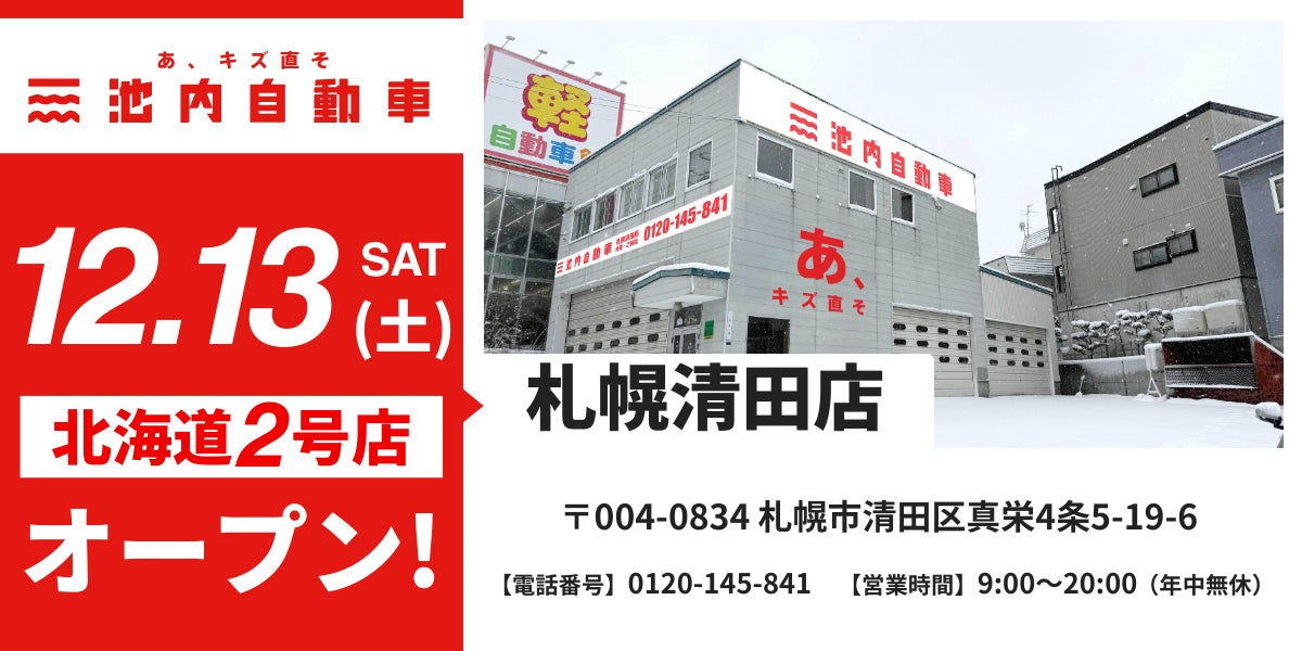 自動車の板金塗装事業を手掛ける株式会社イケウチ(本社:東京都千代田区、代表取締役社長:池内 美友、以下「当社」)は、2025年12月13日(土)に池内自動車 札幌清田店(北海道札幌市清田区)をオープンいたします。