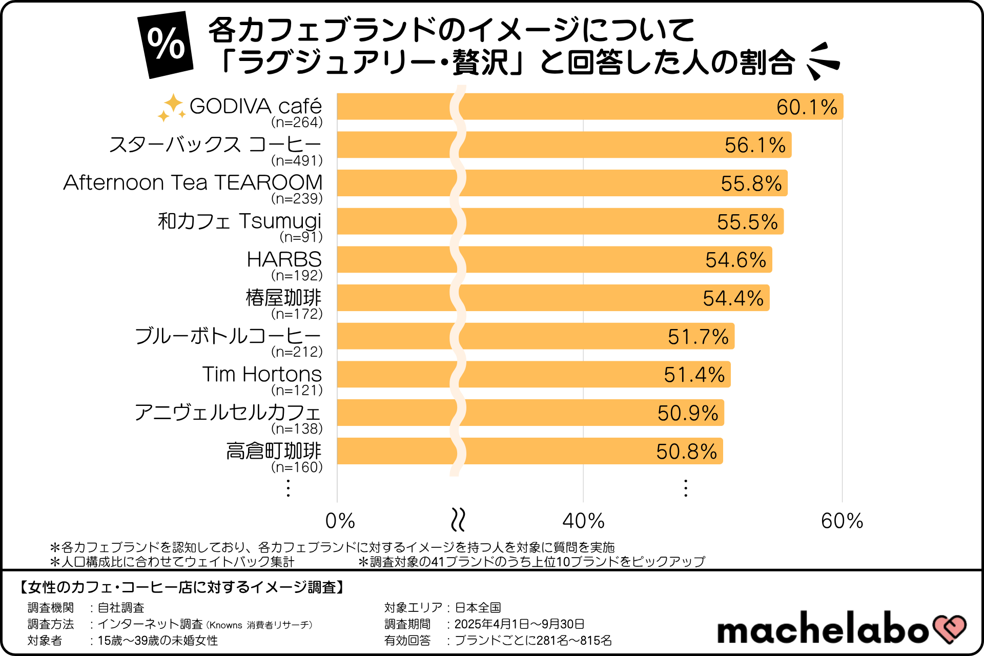 「ラグジュアリー・贅沢」に当てはまると回答した割合が最も高かったのは『GODIVA café』(60.1%)で、豪華で非日常的な体験ができるイメージが強いことが分かります。2位は『スターバックス』の56.1%、3位は『Afternoon Tea TEAROOM』の55.8%、4位は『和カフェ Tsumugi』の55.5%と続きました。