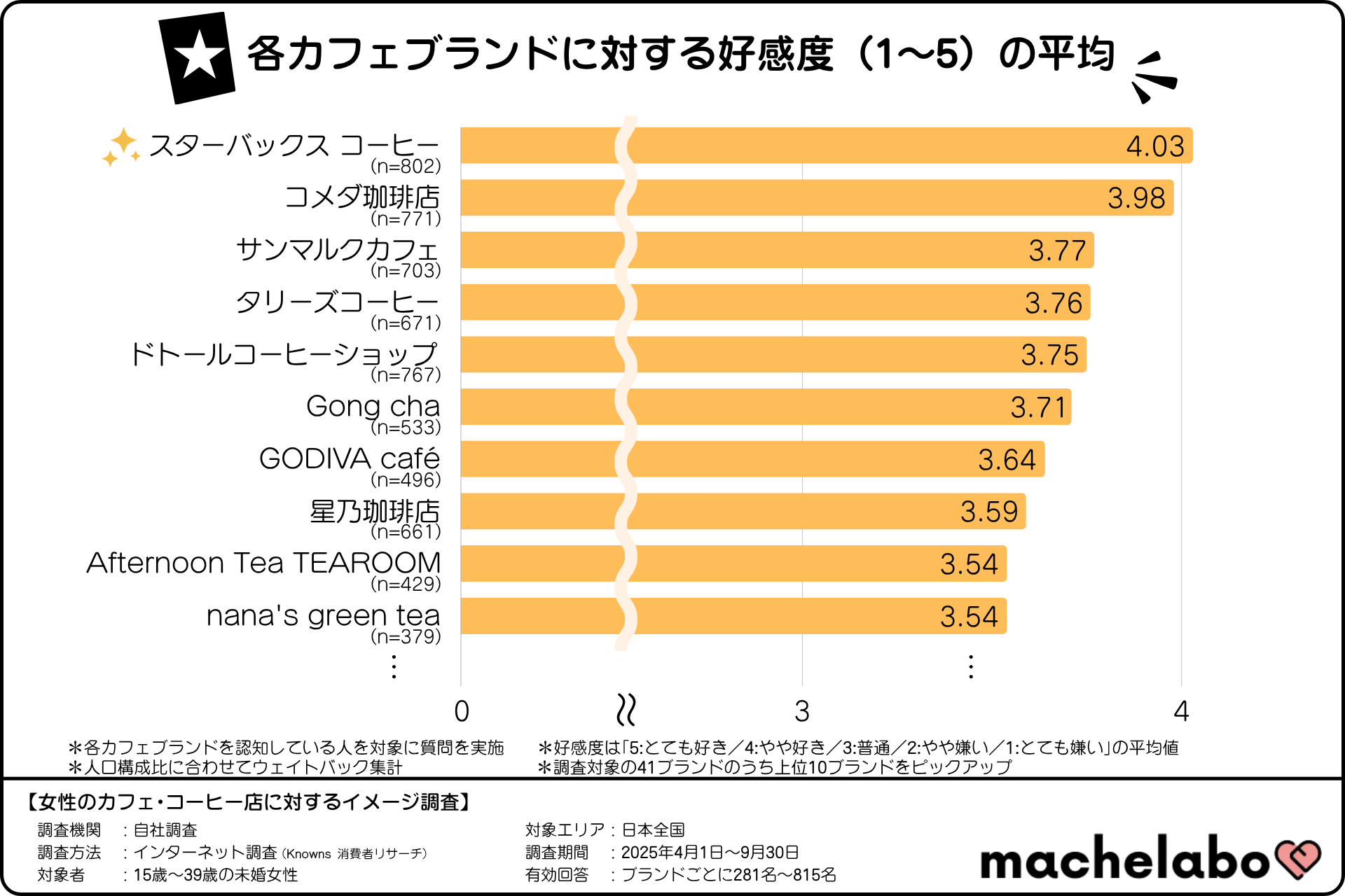 1.好感度は『スターバックス』が4.03でトップ、僅差で『コメダ珈琲店』が続く